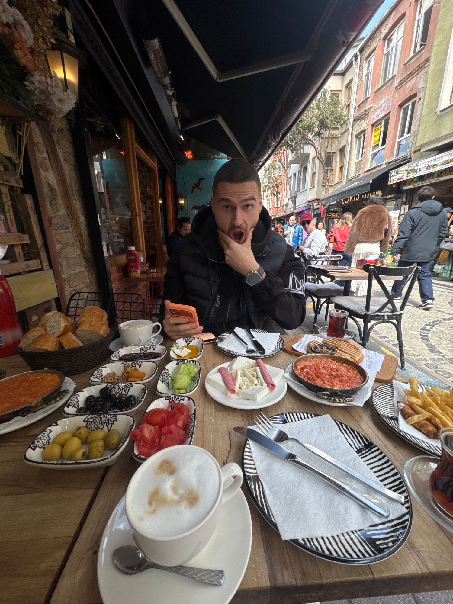 The image depicts a man seated at a table laden with a Turkish breakfast spread, likely at an outdoor cafe in Istanbul, Turkey. The table is wooden and crowded with various small plates containing oli…read more