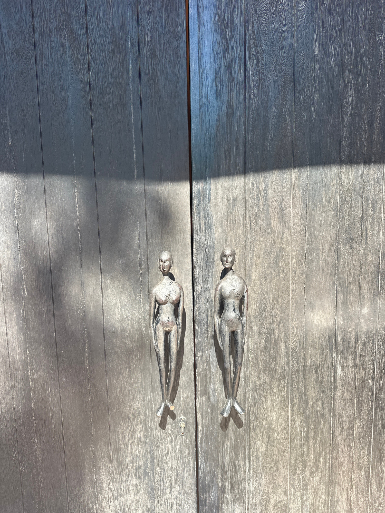 The image shows a close-up of a grey, wooden surface with two silver-colored figurines attached to it. The figurines appear to be stylized human figures with fishtails, possibly mermaids. The surface…read more