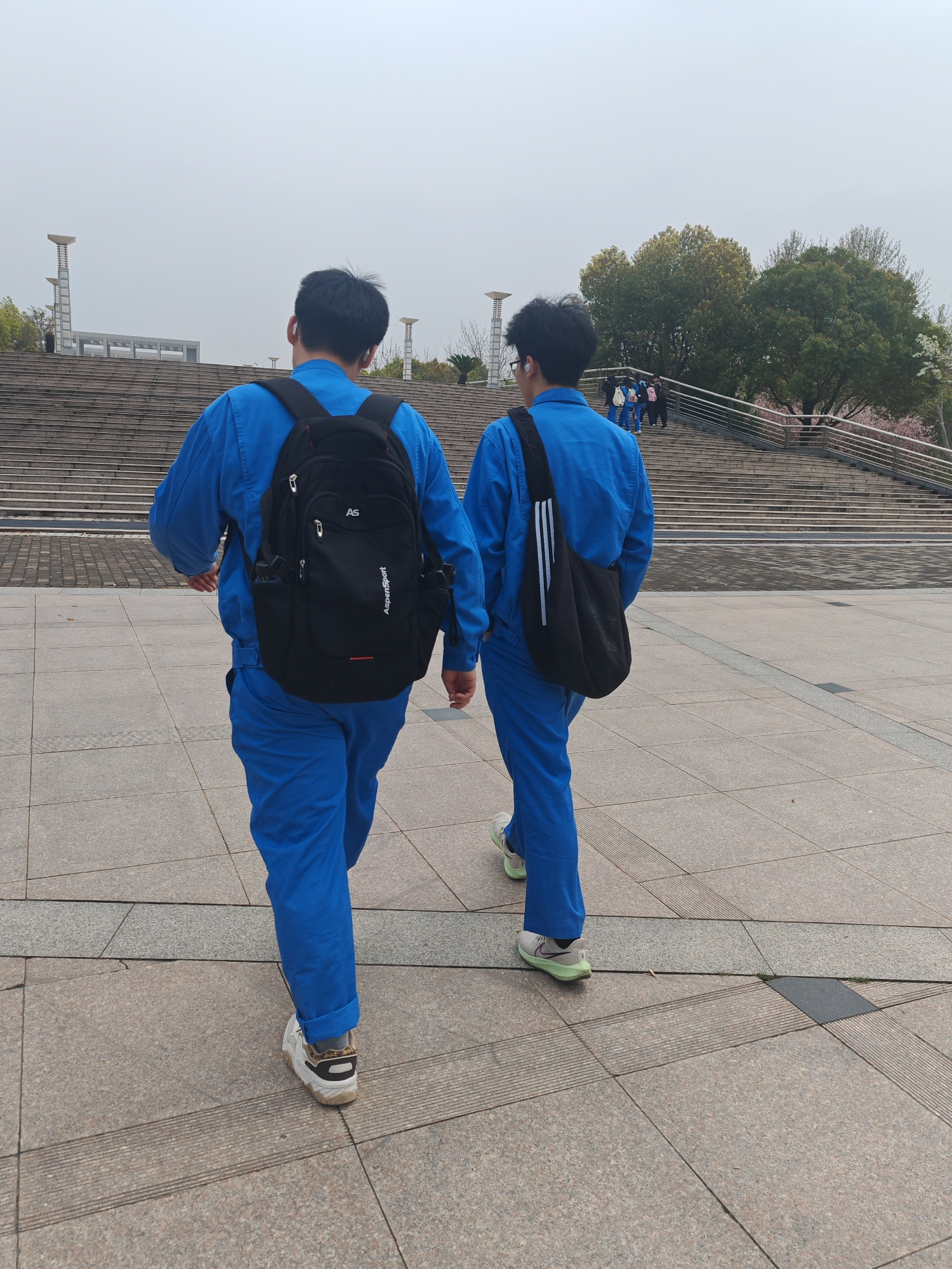 Two people wearing matching blue jumpsuits walk away from the viewer on a paved surface in Jiangning District, China. The person on the left wears a black backpack with the word "AspenSport" written o…read more