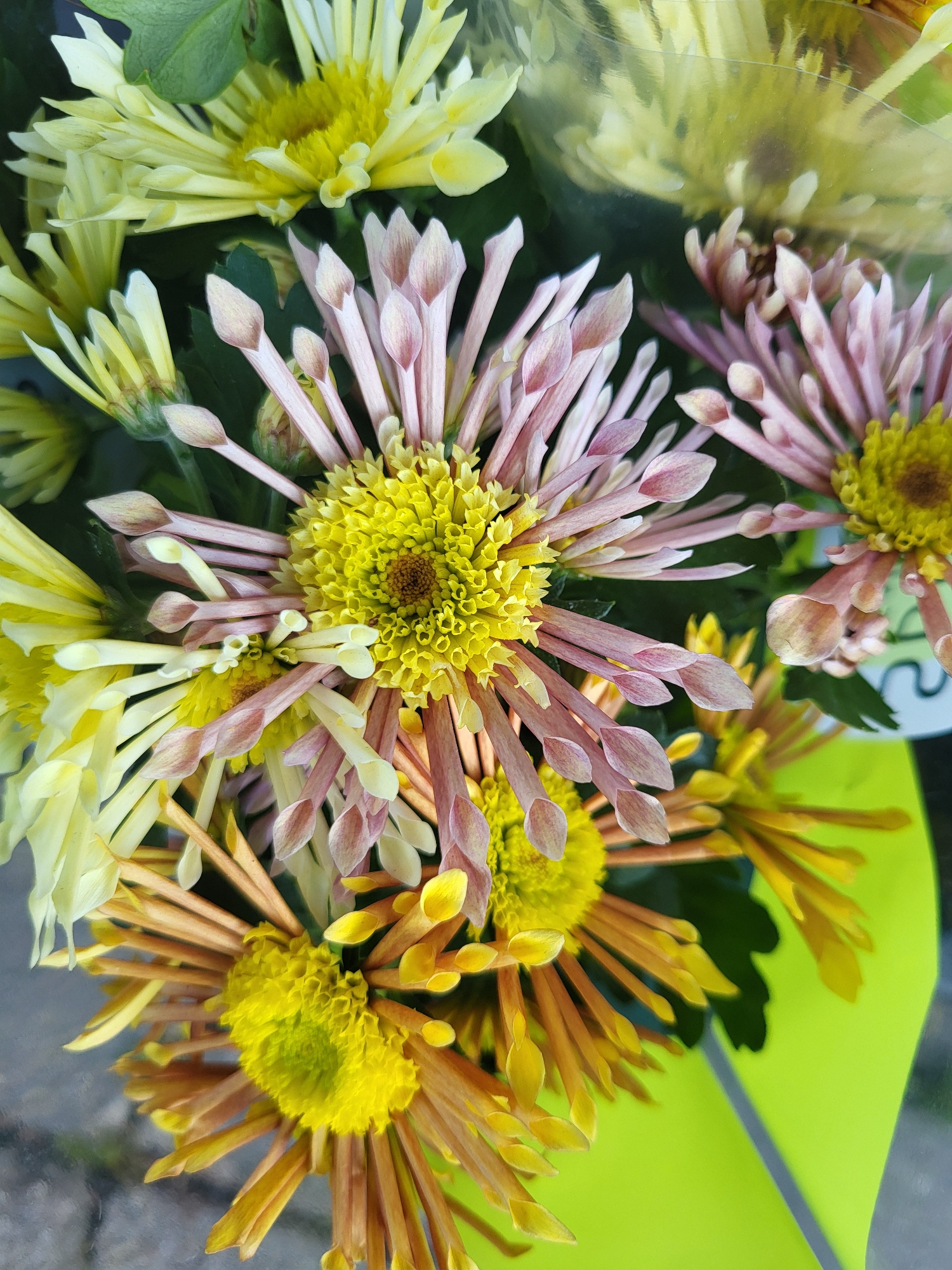 The image presents a close-up view of a bouquet of chrysanthemums, exhibiting a variety of colors. The dominant colors are yellow, light pink, and light brown, with some leaves visible. The bouquet ap…read more