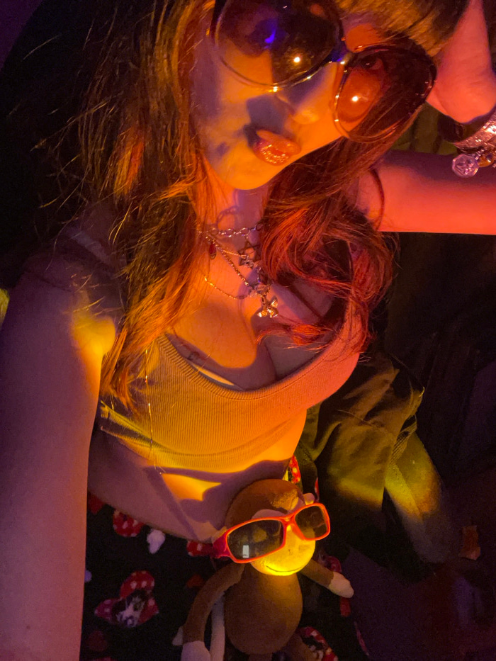 The image depicts a person, likely female, captured in a close-up, upward-angled selfie under prominent warm orange and yellow artificial lighting. The subject's upper face is obscured by large, dark,…read more