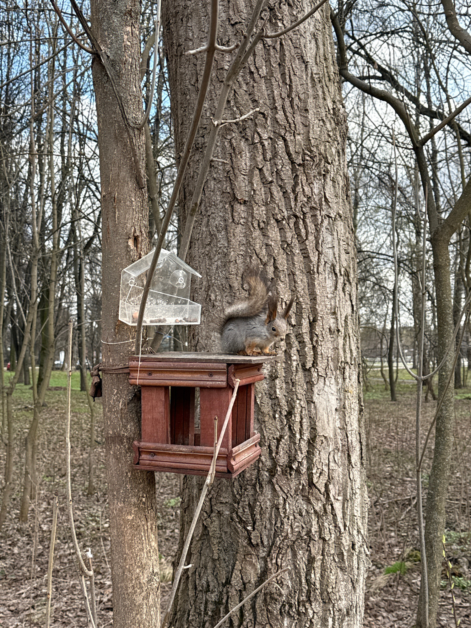 The image depicts a squirrel perched on a wooden bird feeder attached to a tree trunk. The tree is located in Moscow, Russia. The squirrel is facing forward, partly obscured by the feeder. The feeder…read more
