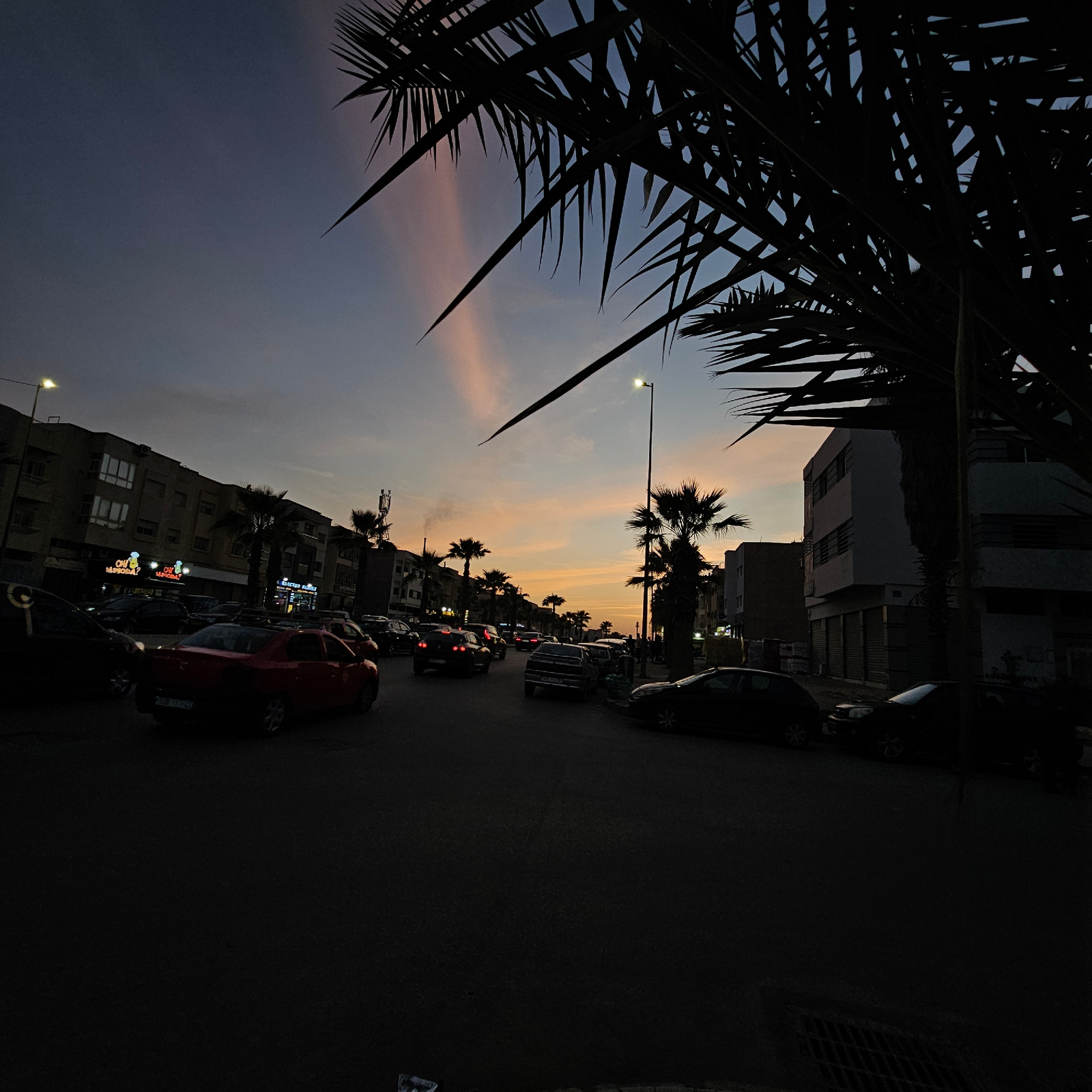 The photograph shows a street scene in Fez, Morocco at dusk. The sky has a gradient of orange and purple. Tall palm trees line the street, with a silhouetted palm frond in the foreground. Cars are parβ¦read more