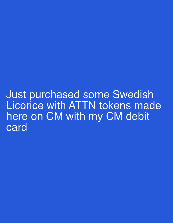 The image displays white text against a solid blue background. The text reads: "Just purchased some Swedish Licorice with ATTN tokens made here on CM with my CM debit card". The content describes an i…read more