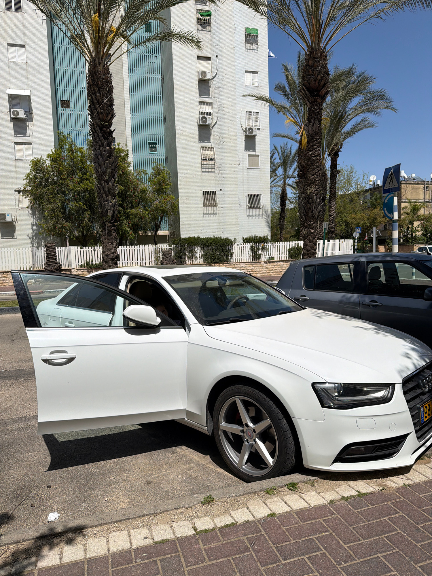 The image depicts a street scene in Kiryat Bialik, Israel, featuring a white Audi parked partially on a brick-paved sidewalk. The driver's side door of the Audi is open. Behind the Audi is a dark-colo…read more
