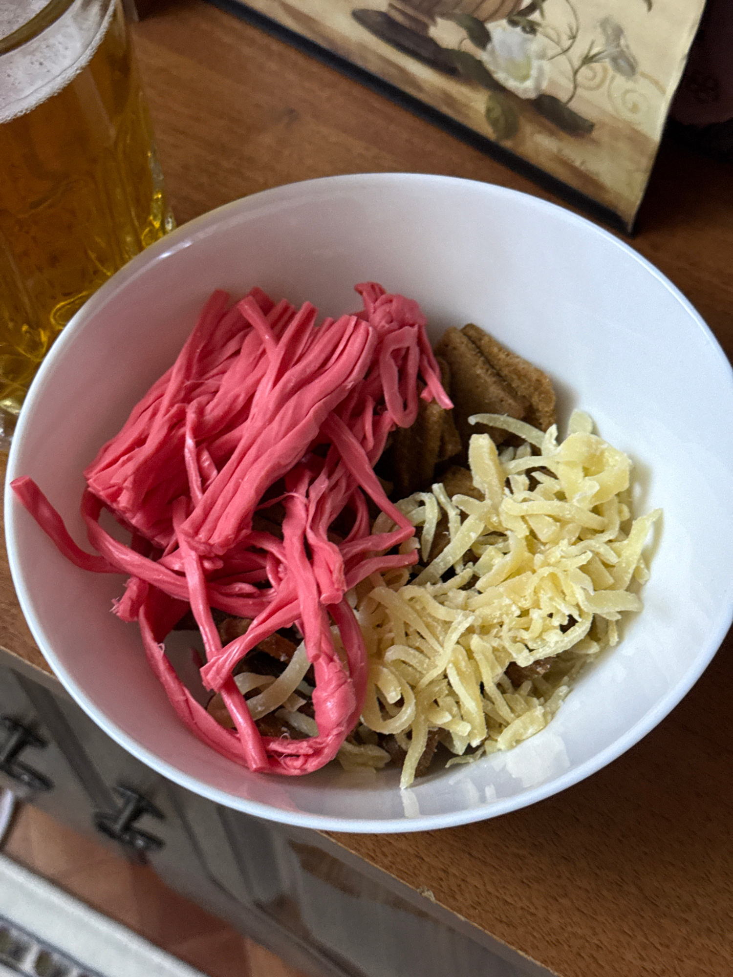 A high-angle shot shows a white bowl containing food. The food consists of three distinct parts: a pile of red, ribbon-like strips; a pile of pale yellow, shredded food (perhaps cheese or processed fo…read more