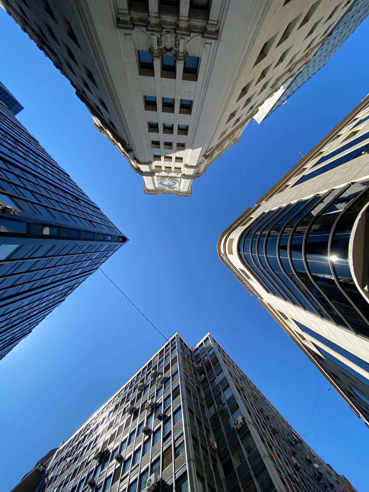 The image shows a worm's-eye view of four buildings in Buenos Aires, Argentina, with a clear blue sky above. The buildings are arranged in a square pattern around the central point of view. The buildi…read more