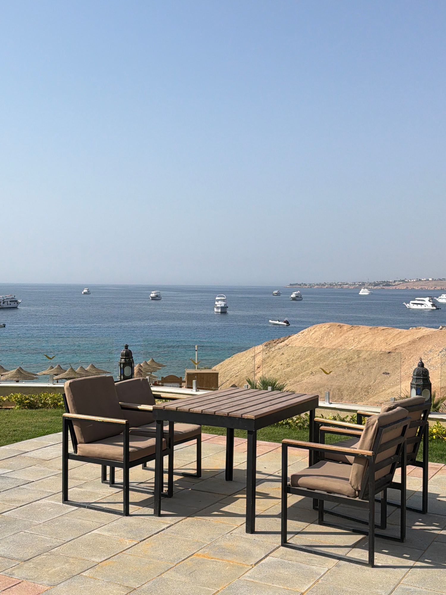This image presents a vibrant, sun-drenched coastal scene, likely from a high- vantage point in Sharm El Sheikh, Egypt. The foreground features an inviting outdoor patio furnished with modern furniture. A rectangular table with a slatted wooden top and dark metal frame occupies the center, flanked by two chairs with matching dark metal frames and comfortable brown cushions. The patio itself is paved with light-colored tiles, and strong sunlight casts sharp shadows of the furniture, indicating a clear, bright day. Beyond the patio, a sandy, arid cliff face descends towards the brilliant blue sea. Numerous boats, including several large yachts and smaller vessels, are scattered across the water, suggesting a popular marine environment. In the distance, a faint coastline stretches along the horizon. Directly below the cliff and patio edge, a few straw beach umbrellas are visible on what appears to be a beach area, although no people are present. The sky overhead is a vast expanse of clear, pale blue. A decorative black lantern-style lamp is positioned on the patio overlooking the view. There is no visible text or specific activity taking place, but the setting evokes a sense of peaceful leisure and scenic beauty. | Open Wire
