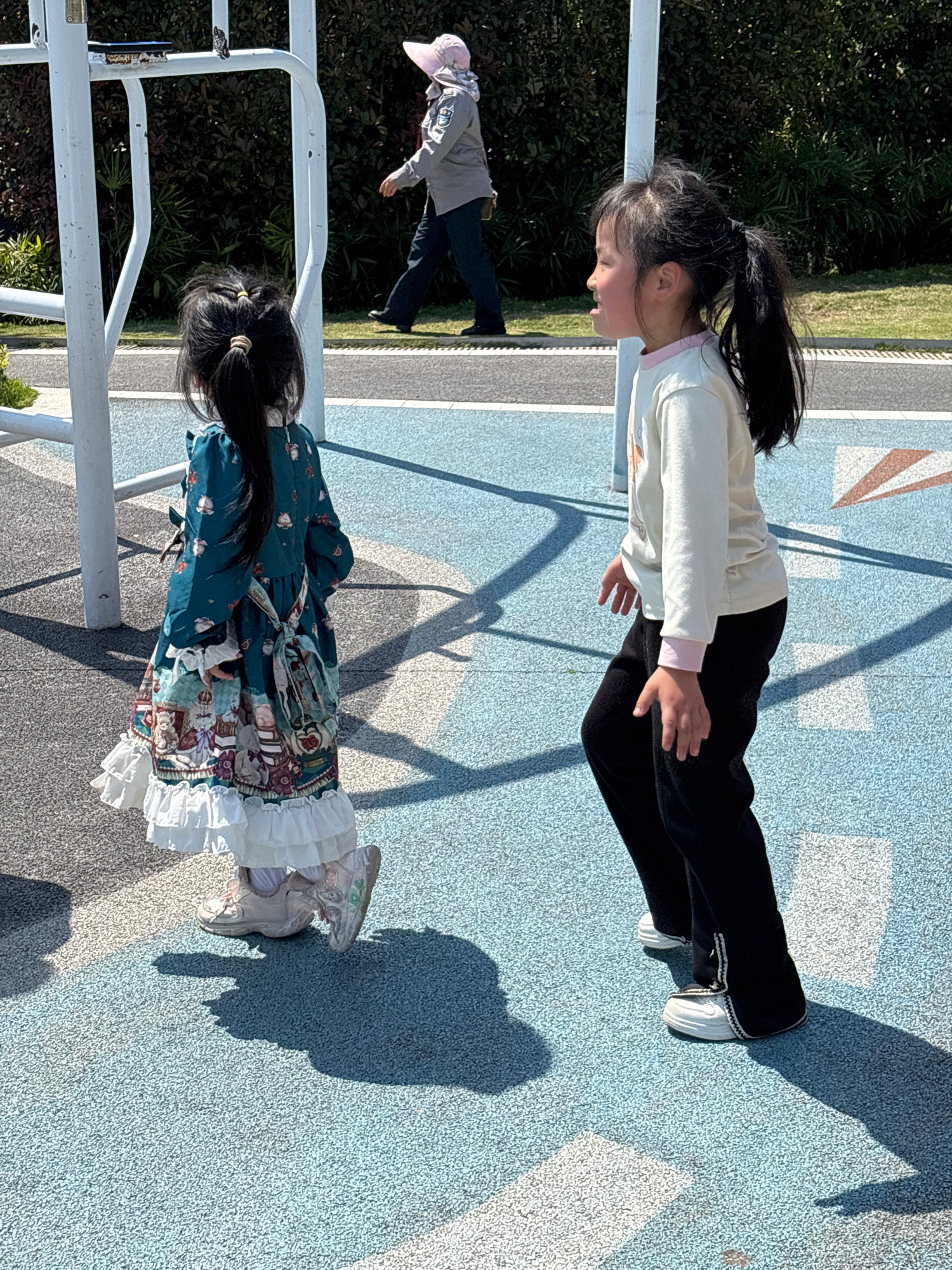 A long outdoor shot shows two children on a light blue, concrete-surfaced playground area bordered by greenery; a third person in a pink hat is partially visible at left. A young girl in a pale-colore…read more