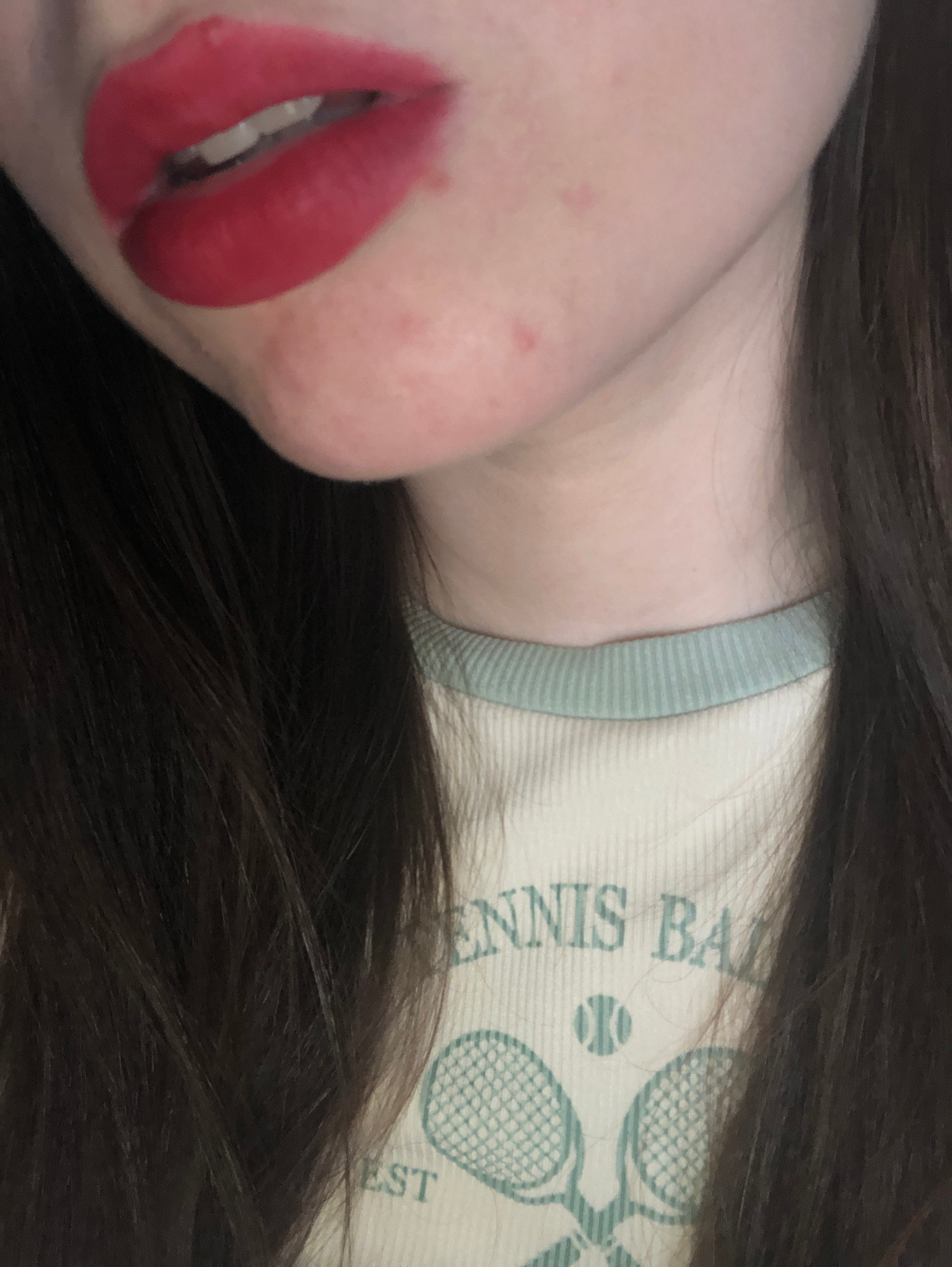 A close-up shot features a person's face angled slightly to the left. Bright red lipstick is prominently displayed on the lips. The skin tone is light with some visible texture. The person is wearing…read more