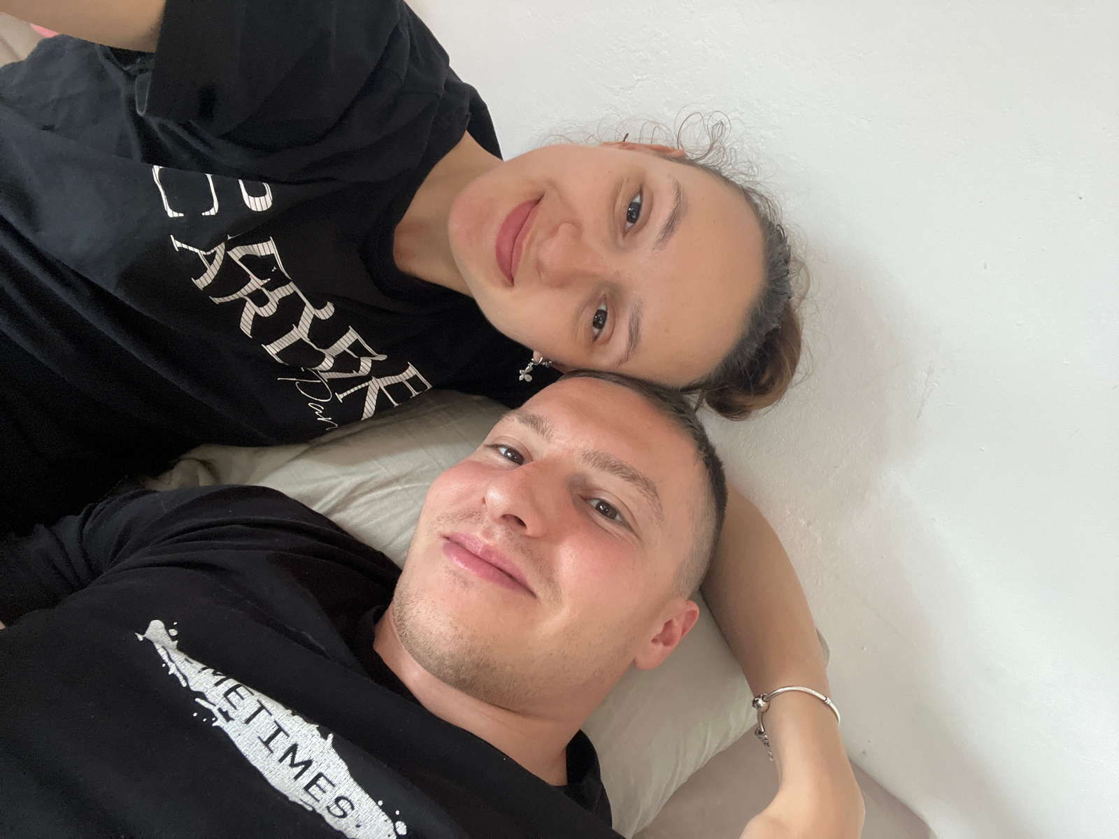 A young man and a young woman are captured in an overhead shot, lying side-by-side indoors, likely on a bed or floor, with their heads close together. They are both looking directly up at the camera,…read more