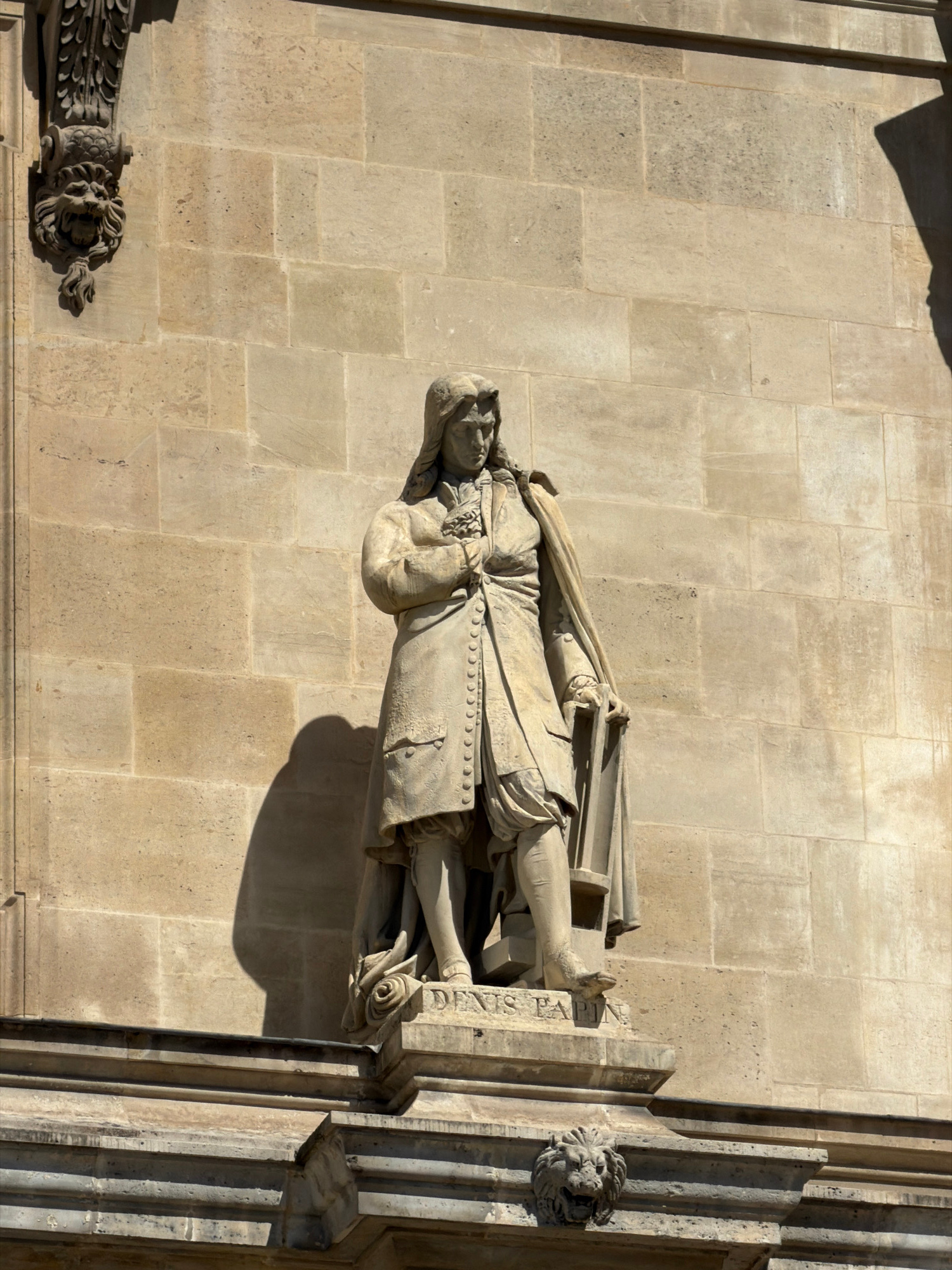 A statue of a man is affixed to a stone building in Paris, France. The man is dressed in 17th or 18th century garb. A stone wall is in the background. A stone ornament is on the bottom left. A pillarβ¦read more