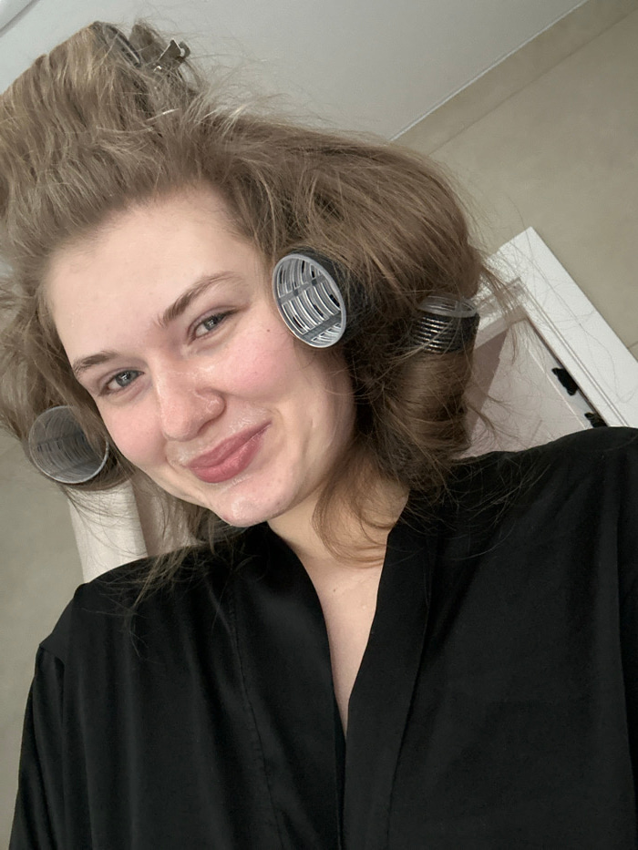 A woman with fair skin smiles at the camera. She has hair rollers in her blond hair. The woman is wearing a black robe, possibly satin. A white doorframe is in the background, and the rest of the imag…read more