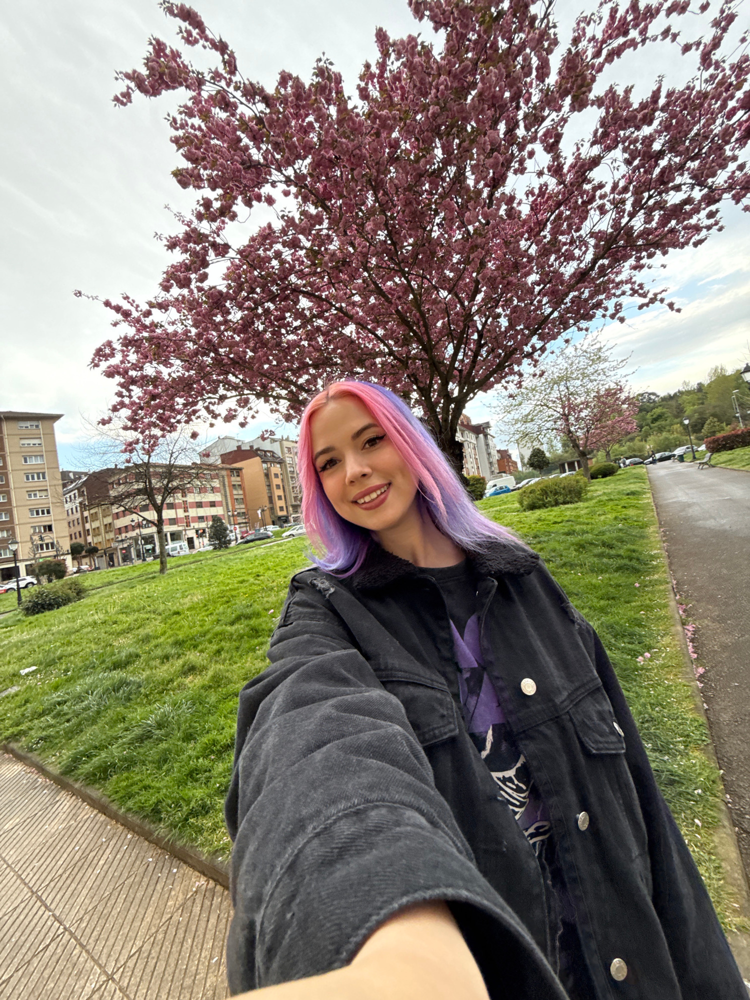 The image shows a young woman with pink and purple hair taking a selfie outdoors. She is wearing a black denim jacket over a graphic t-shirt. Behind her is a flowering cherry tree with pink blossoms.…read more