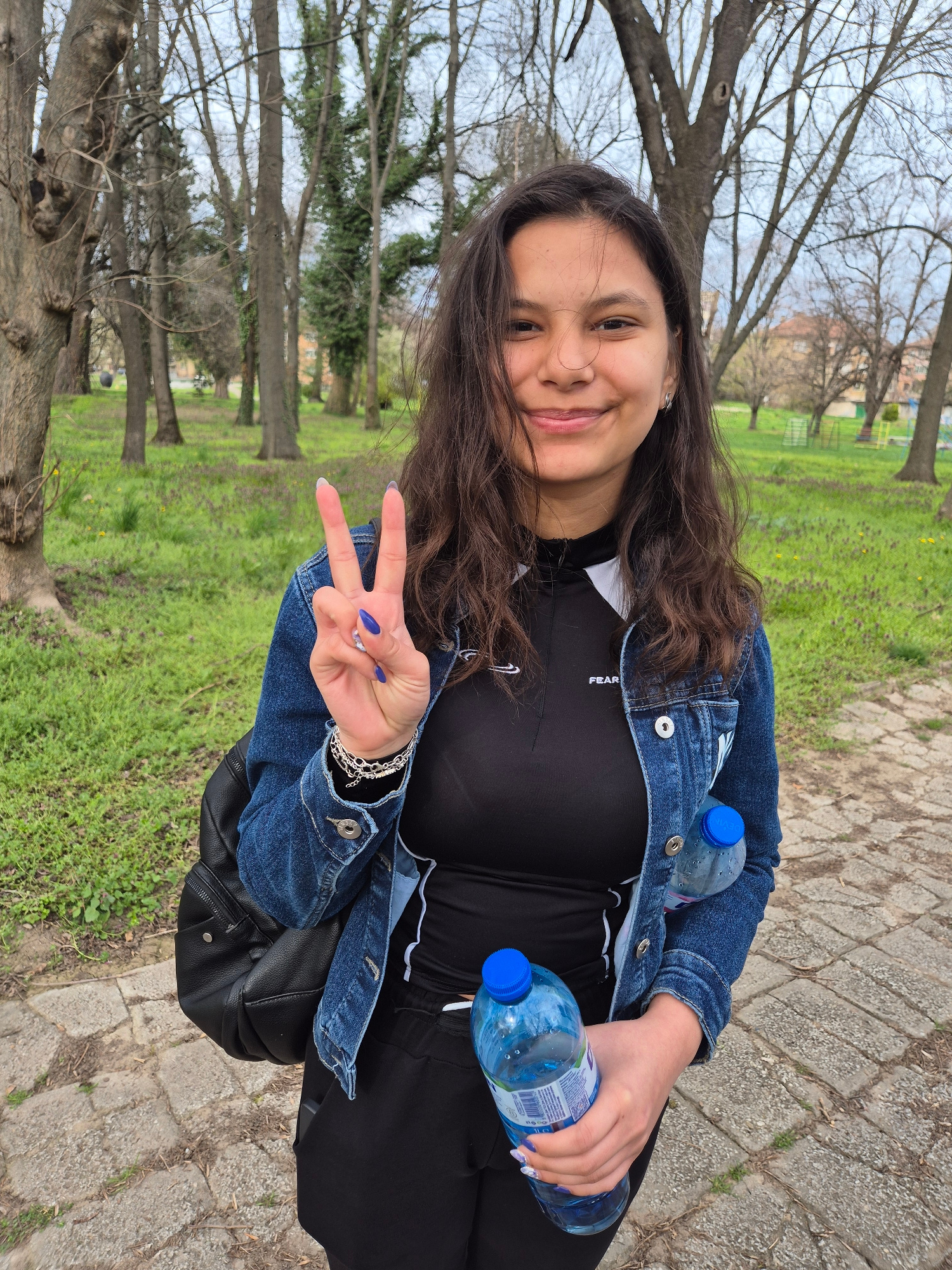 A young woman stands outside in what appears to be a park. She is holding two bottles of water, and making a peace sign with her hand. She is wearing a denim jacket, black shirt, and black pants. In t…read more