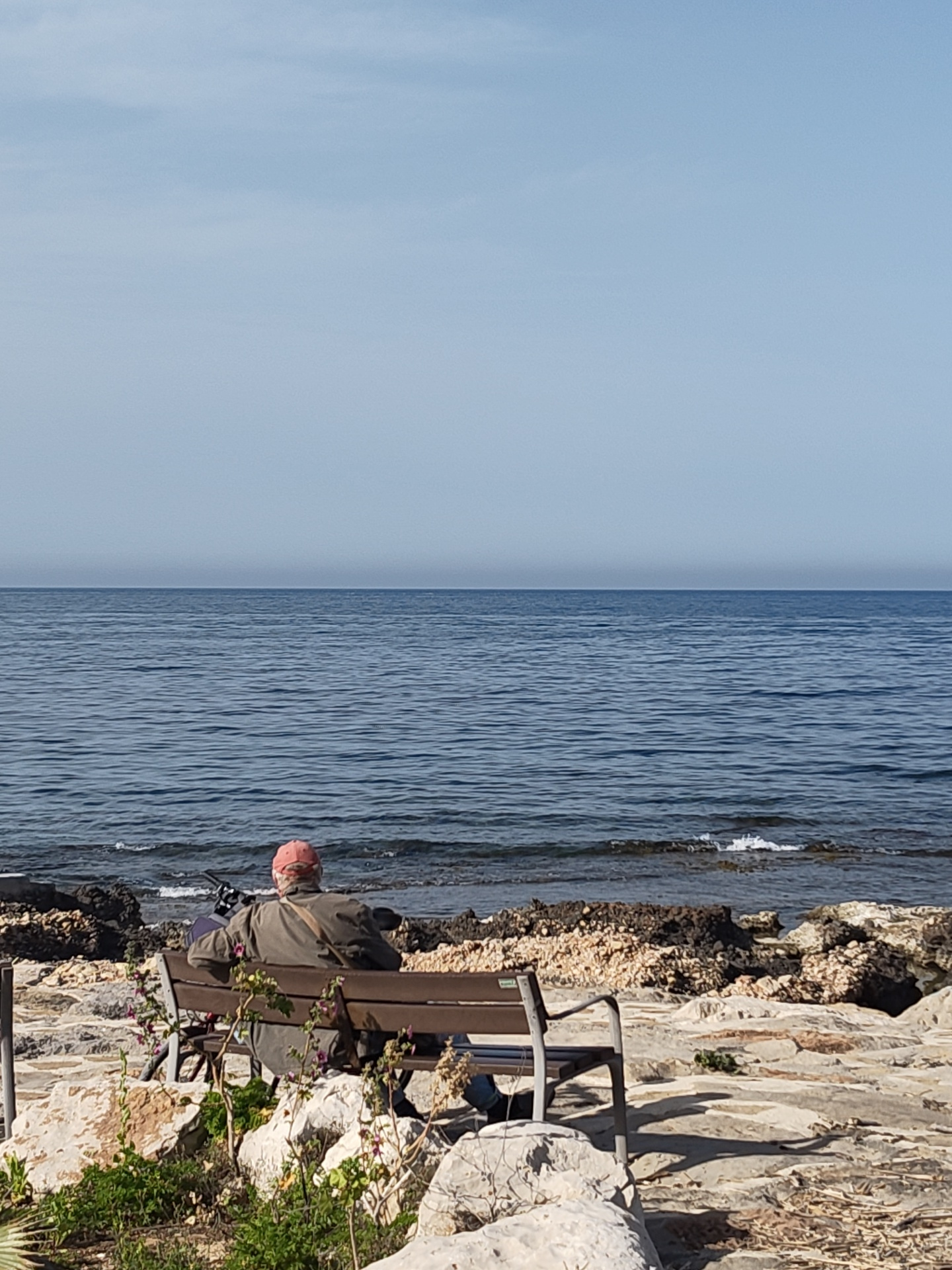 A man is sitting on a wooden bench facing the sea. He is wearing a light-colored hat and a jacket. The bench is located on a rocky shoreline, with the sea stretching out to the horizon under a clear s…read more