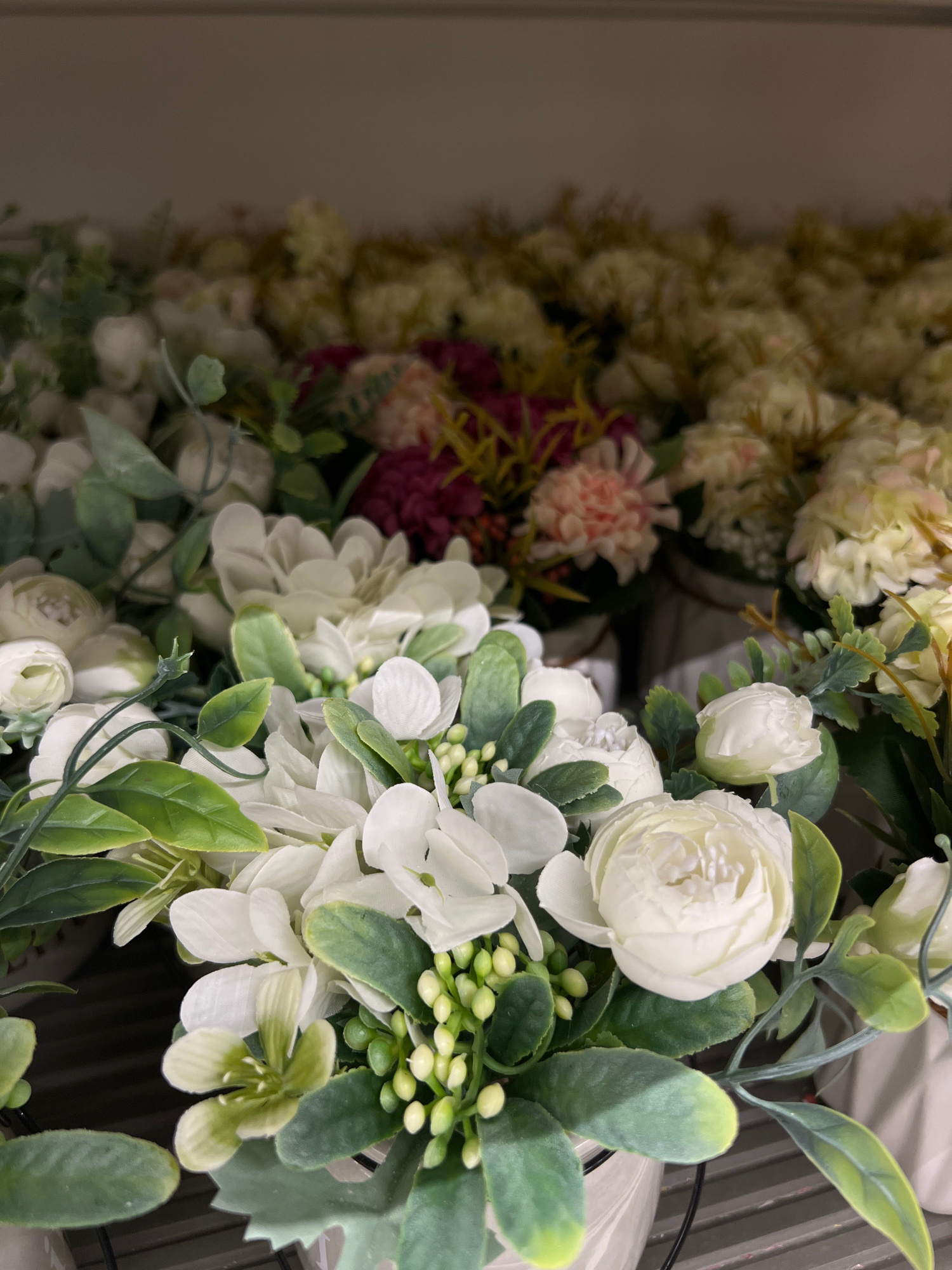 The image displays an arrangement of artificial flowers and greenery. Predominantly, there are white flowers with layered petals, alongside green foliage with rounded leaves. Some of the leaves exhibi…read more