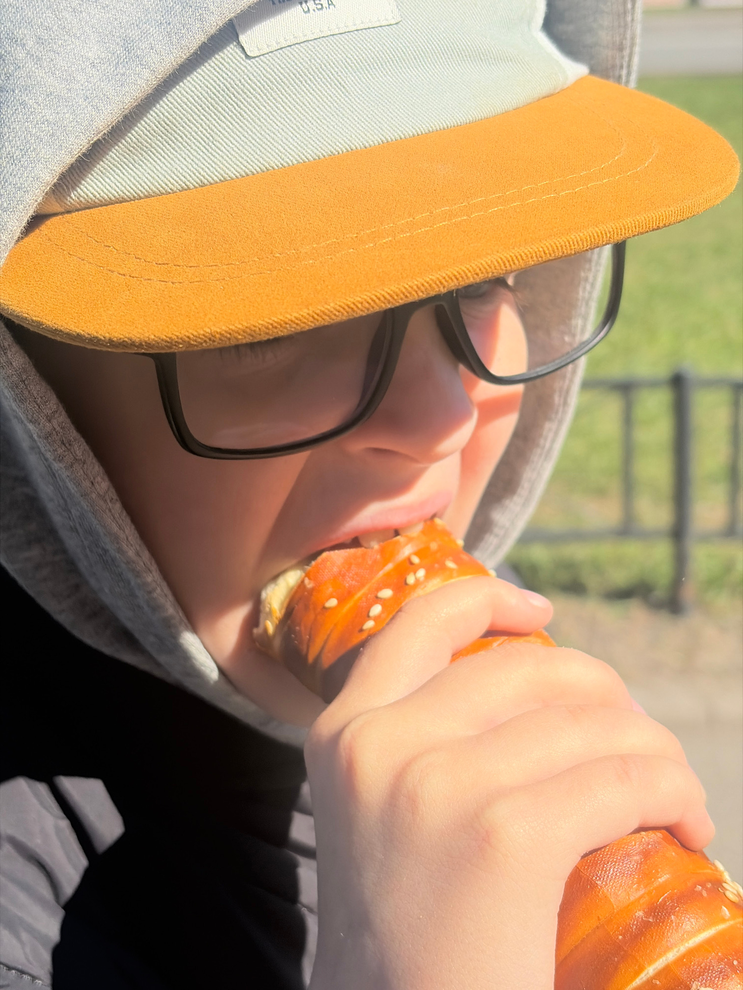 A close-up, high-angle shot captures a person, likely a child or young adult, eating outdoors in what appears to be a sunny setting in Saint Petersburg, Russia. The individual is seen from the nose up…read more