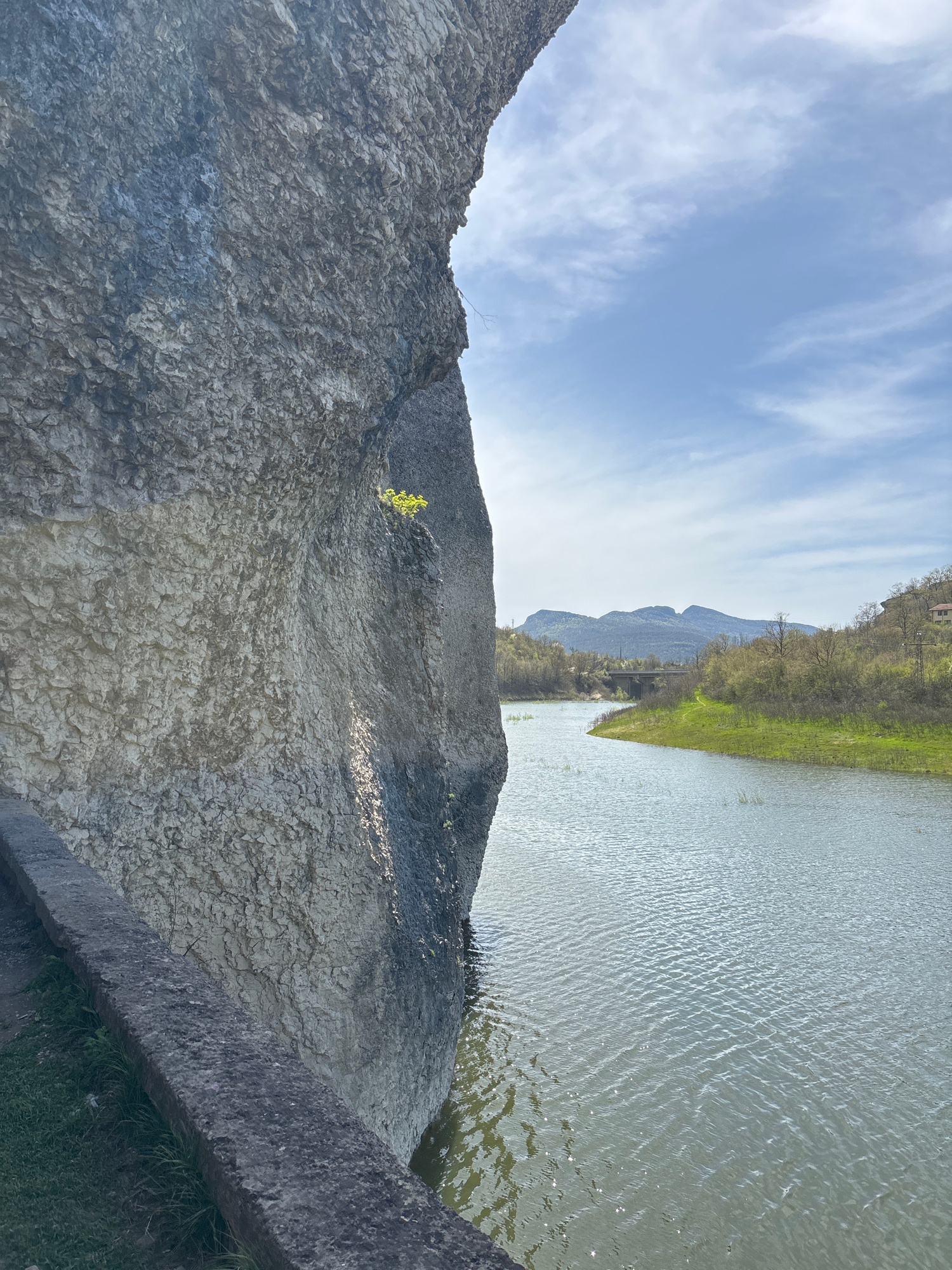 This image presents a vibrant natural landscape, likely captured in Asparuhovo, Bulgaria, under bright daylight. The scene is characterized by a prominent, rugged rock face that dominates the left sid…read more