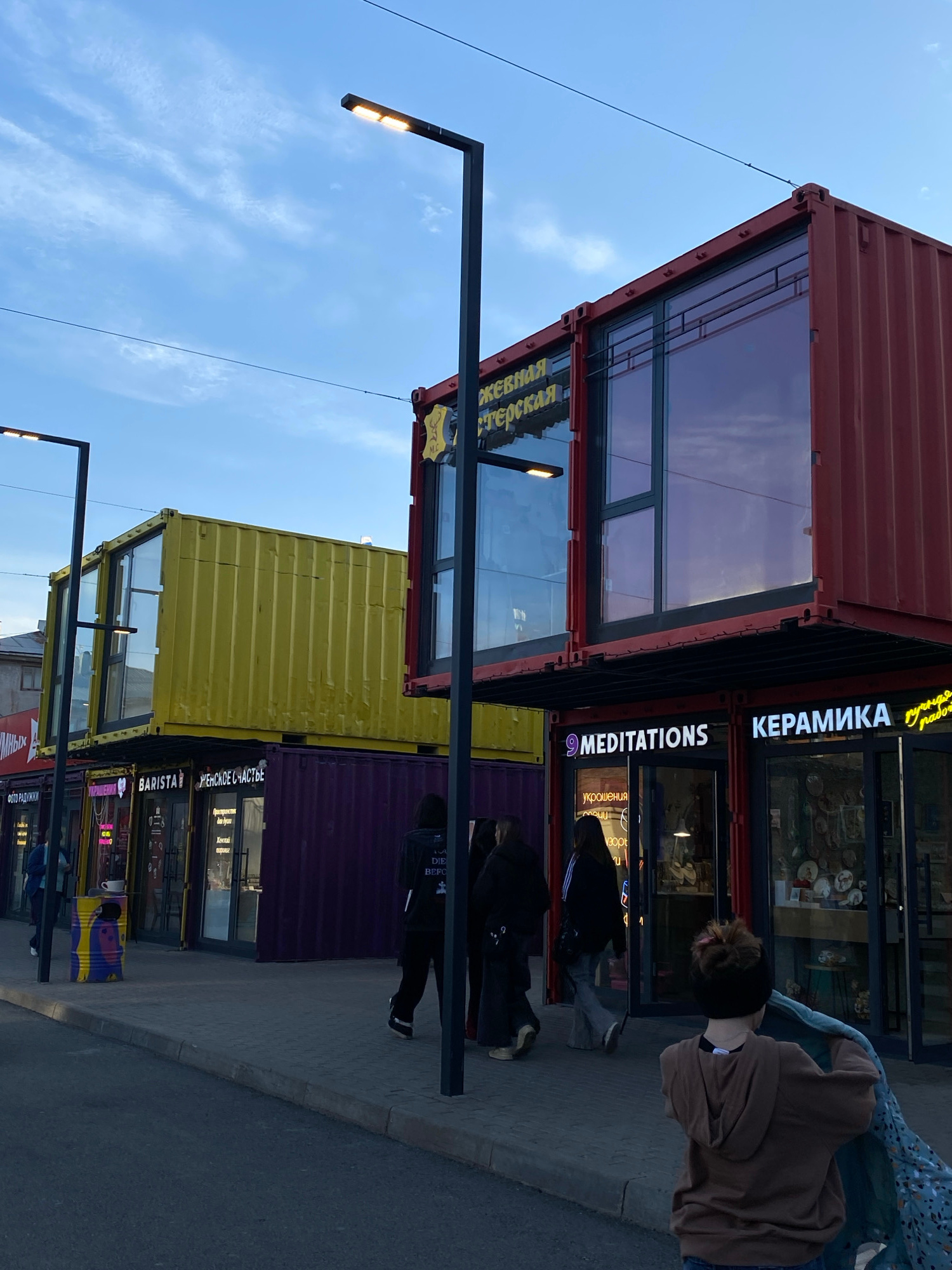 This image depicts a modern urban scene in Ufa, Russia, featuring a series of repurposed shipping containers functioning as commercial establishments. The containers are stacked and arranged, showcasi…read more