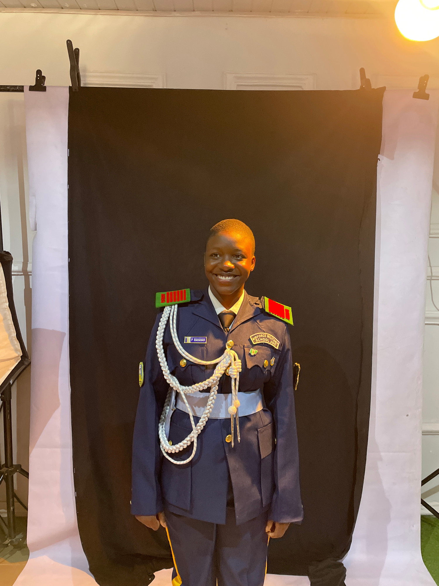 The photograph depicts a young person in an Air Force Military School uniform standing in front of a backdrop consisting of black fabric over a white sheet. The uniform is blue with red and green epau…read more