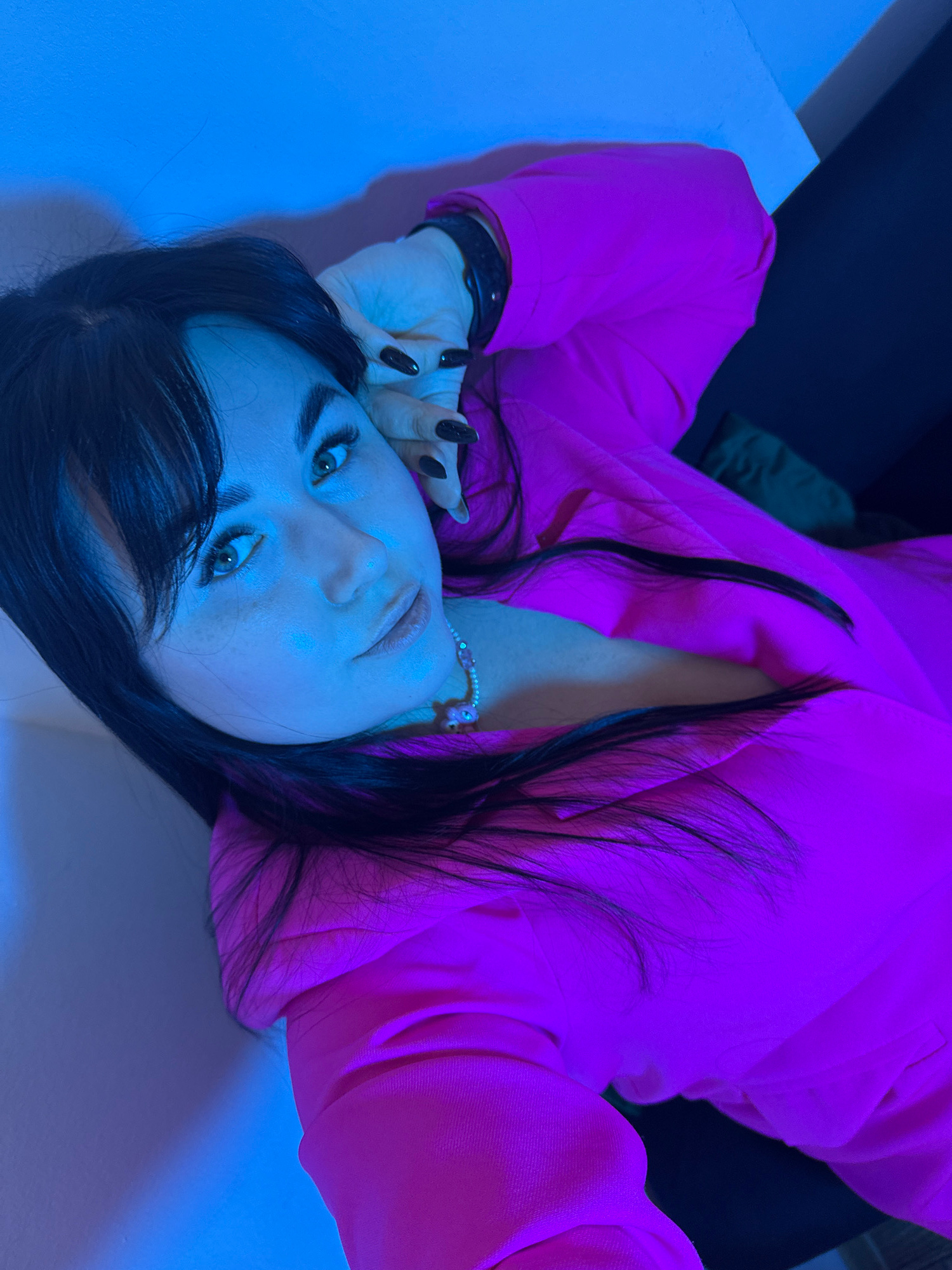A woman lies at an oblique angle, possibly supine, with her head tilted upwards towards the camera, surrounded by a cool blue light source on her left. She has black hair with bangs across her forehead, fair skin, and visible green eyes. She wears a pink suit jacket and a light-colored necklace. Her left hand is raised near her face, with fingernails painted in a dark color. The background is partially visible and appears to be a mix of black and white surfaces, potentially part of a set or interior. The location in the city of Chaikovsky, Russia is not discernible from the visual elements in the provided image. | Open Wire