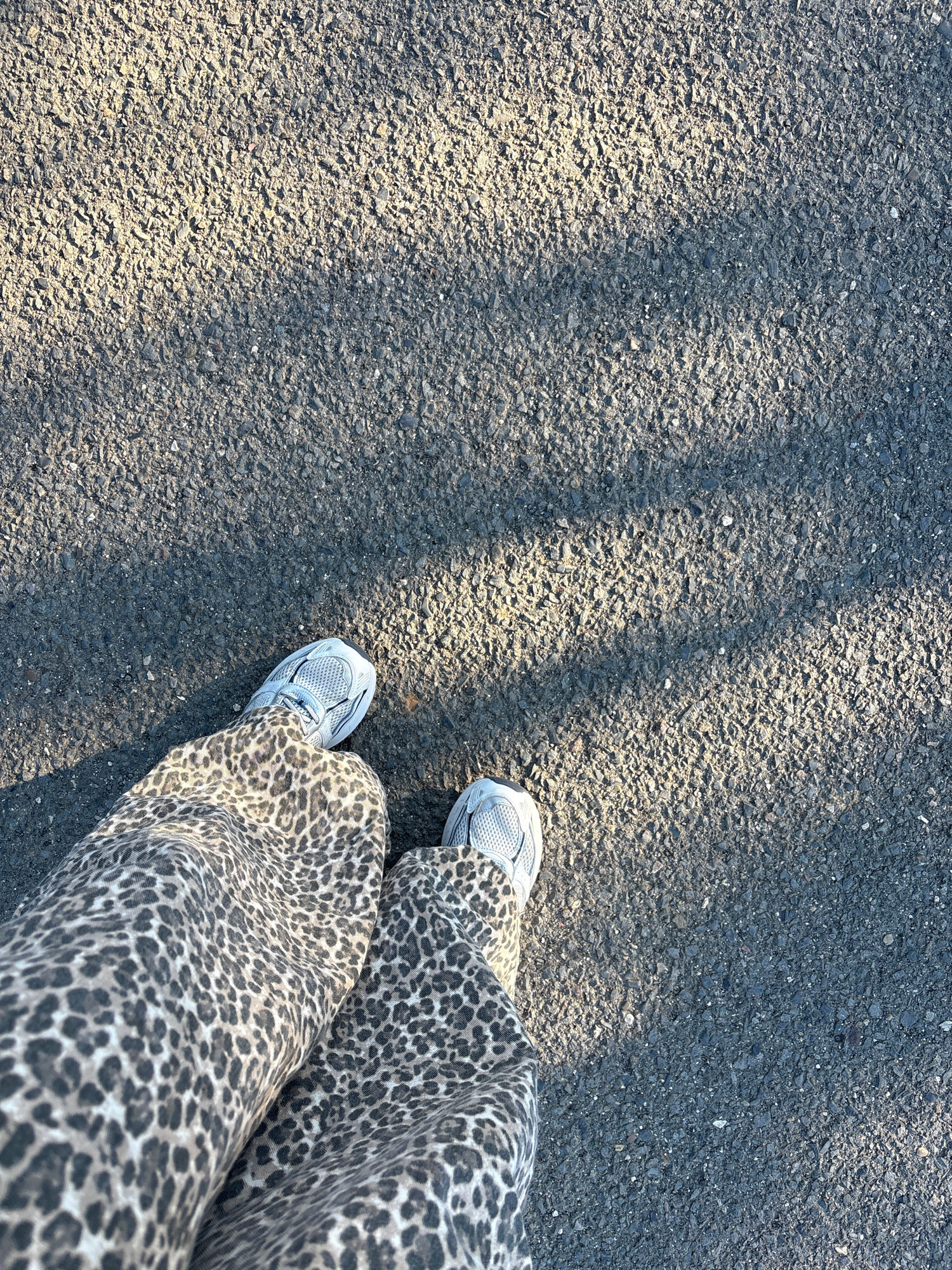 The image shows a section of asphalt pavement in Urbanización Encinares De Alcolea, Spain. A pair of legs clad in leopard-print trousers and white running shoes are visible on the right side of the fr…read more