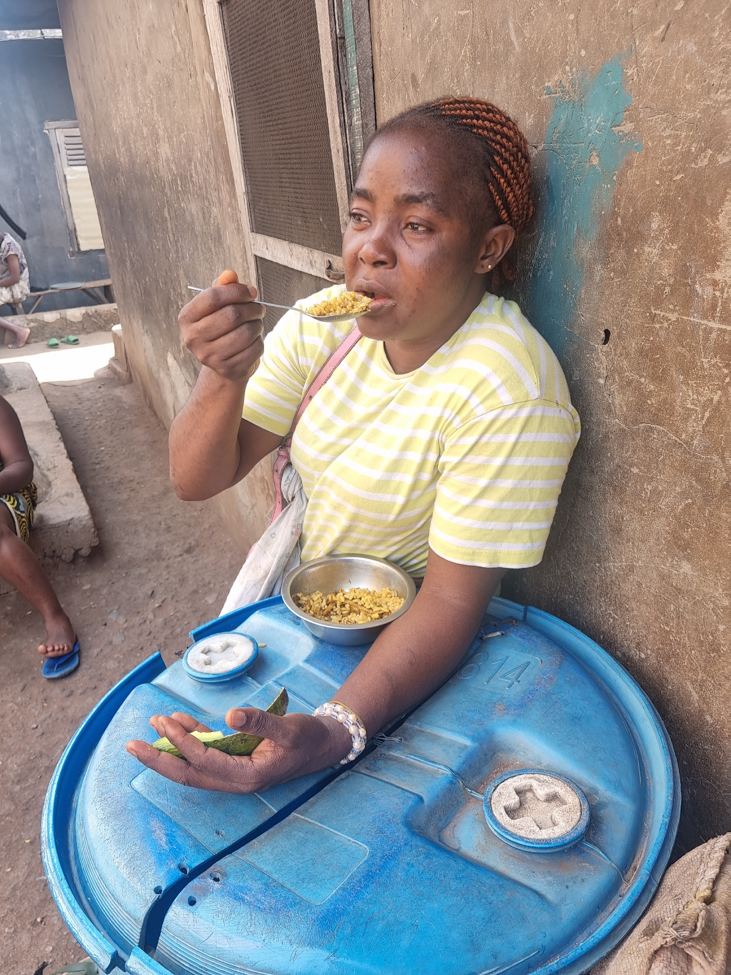An outdoor, slightly rotated, overhead shot captures a woman eating, framed against a textured wall and ground. The main subject is a woman with dark skin and reddish-brown braided hair, wearing a yel…read more