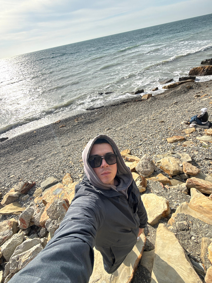 The image depicts a coastal scene in Anapa, Russia. In the foreground, a male individual is taking a selfie, holding the camera at arm's length. He wears dark sunglasses, a grey hooded sweatshirt with…read more