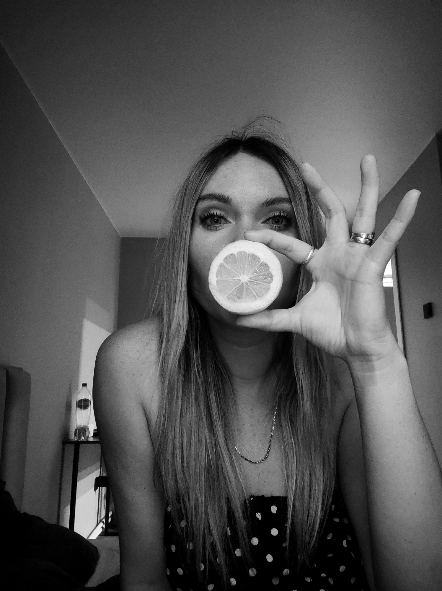 A black and white photograph shows a woman indoors holding a lemon slice to her mouth with her hand. The woman has long hair, and is wearing a necklace, rings, and a polka dot top. A bottle of water s…read more