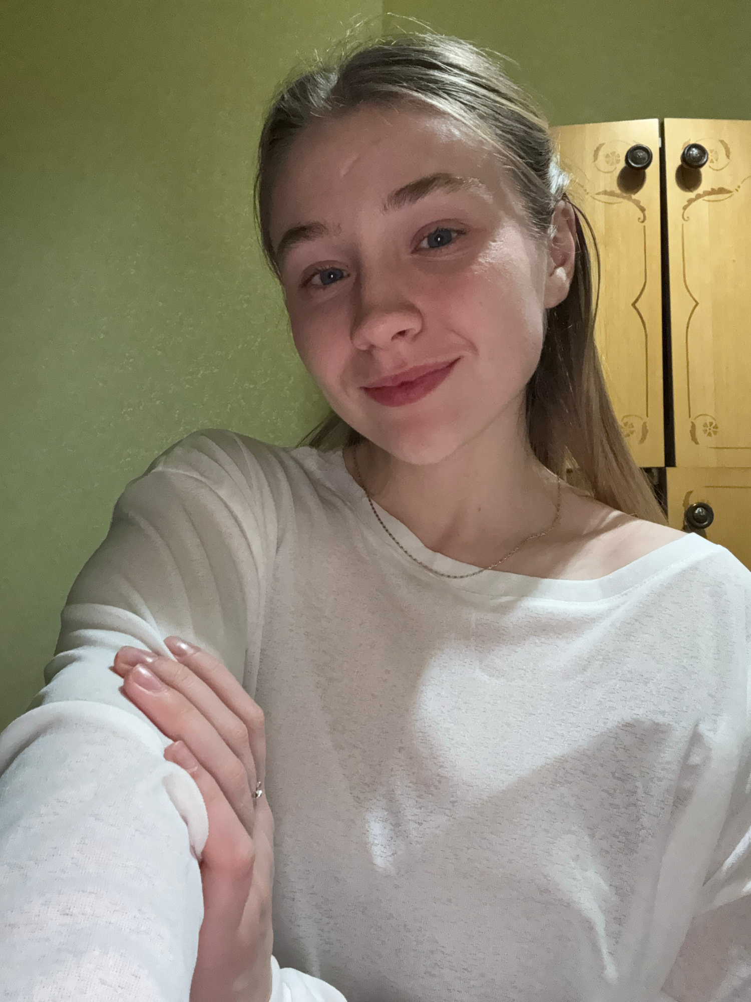 A fair-skinned young woman is photographed indoors, angled to the left. She is wearing a light-colored, long-sleeved shirt and a delicate necklace. Her hands are visible, folded over her arm, and a riβ¦read more