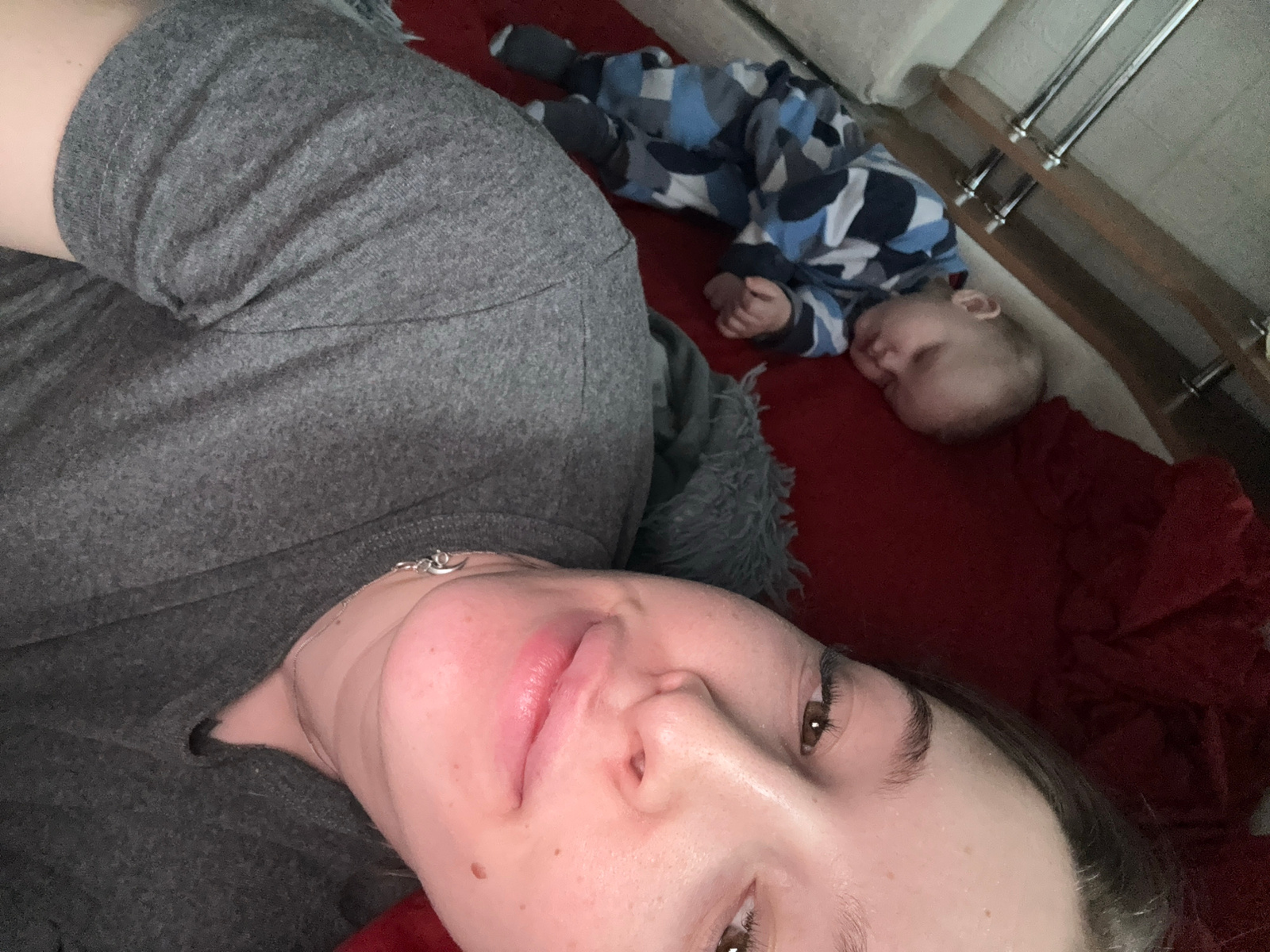 The image shows a person lying on a red surface next to a baby. The baby is wearing a blue and white patterned outfit. The person is wearing a gray shirt and has a necklace on. A metal rack is also vi…read more