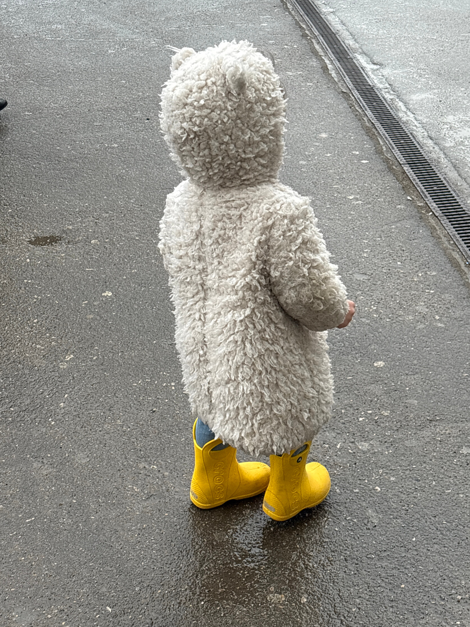 A child wearing a white, fleece-like jacket and yellow Crocs stands on grey asphalt, seemingly outdoors. A metal grate is partially visible near the child. No further information is available to deter…read more