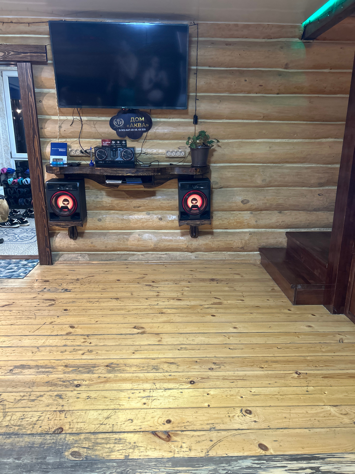 The image shows an interior wall of a log cabin-style room. The wall is made of light-colored, vertically arranged logs. A flat-screen TV is mounted on the wall, along with a shelf unit holding a ster…read more