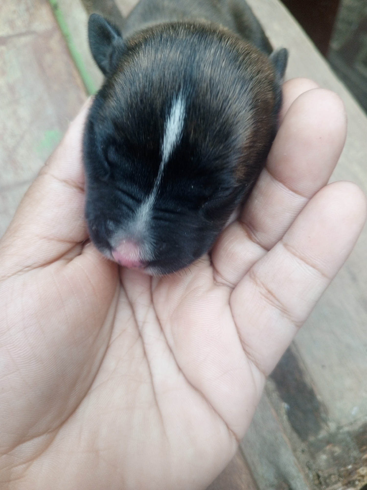 A close-up image shows a very young puppy resting peacefully in the palm of a human hand. The puppy, likely a newborn, is black or very dark brown with a prominent white stripe running down the center…read more