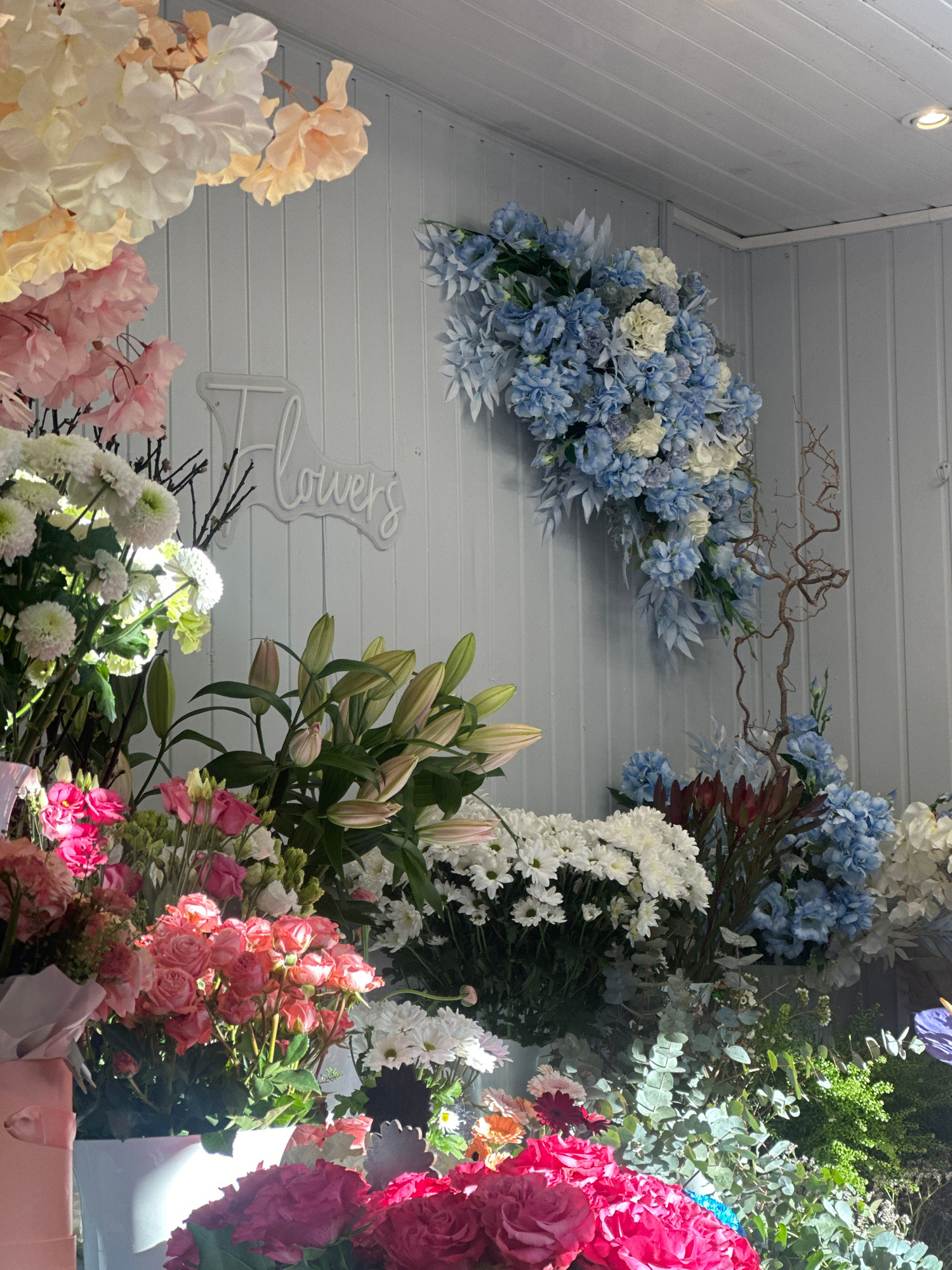The image showcases a florist shop, likely in Liepaja, Latvia, given the request. The background features a wall with horizontal grooves, partially adorned with a cursive "flowers" sign. A variety of…read more