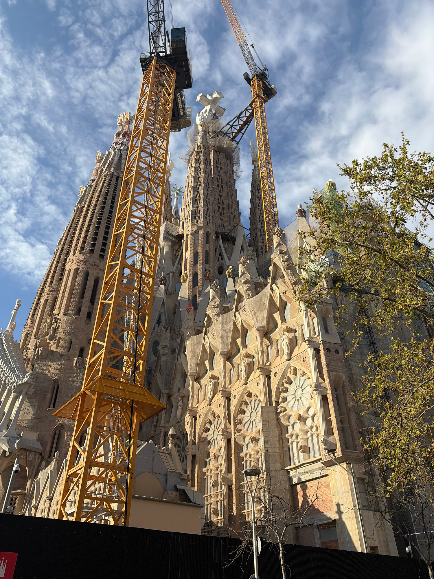The image captures a low-angle view of the Sagrada Familia basilica in Barcelona, Spain. Two large yellow construction cranes are prominently positioned in front of the building, suggesting ongoing co…read more
