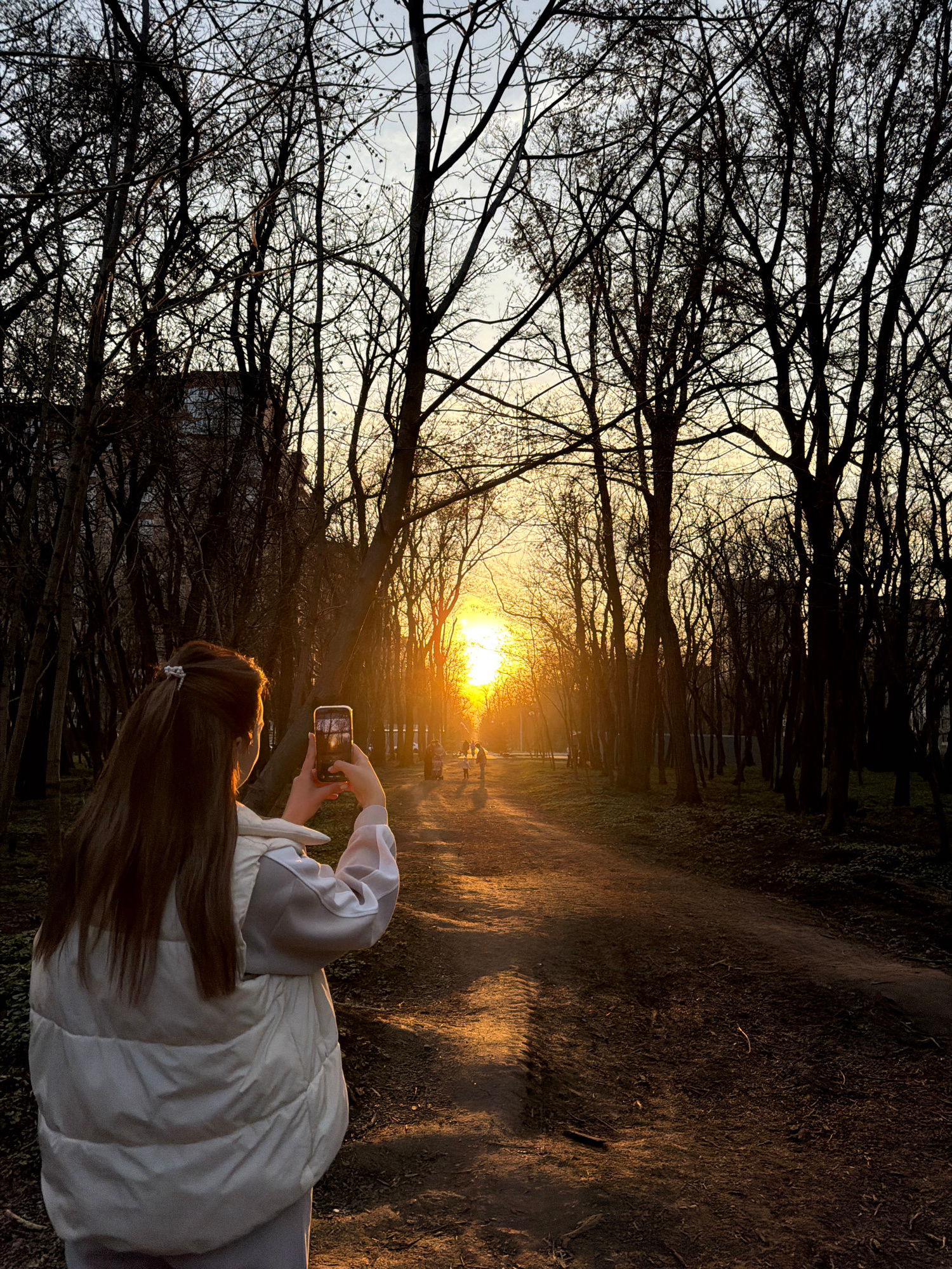 The scene depicts a park pathway in Rostov-on-Don, Russia, at sunset. A female individual, observed from the rear, occupies the left-center foreground. She has long, dark brown hair, partially secured…read more