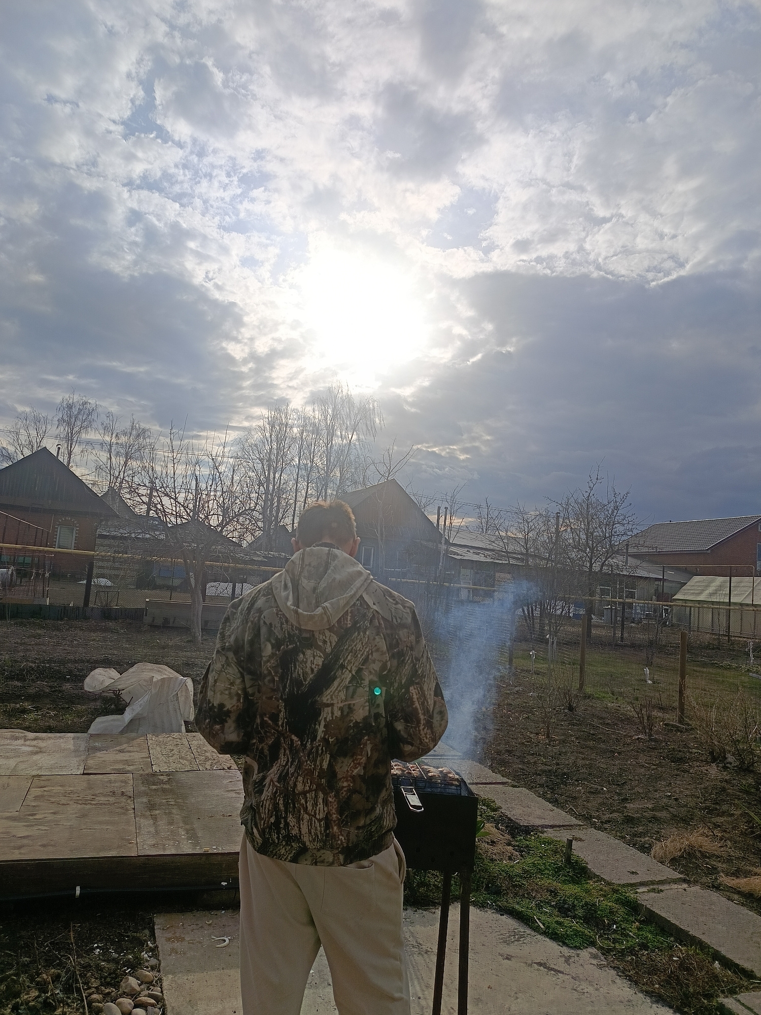 An outdoor scene in Chaikovsky, Russia, captures a person grilling under a cloudy yet brightly lit sky. The individual, seen from the back, is wearing a camouflage-patterned hooded jacket and light-co…read more