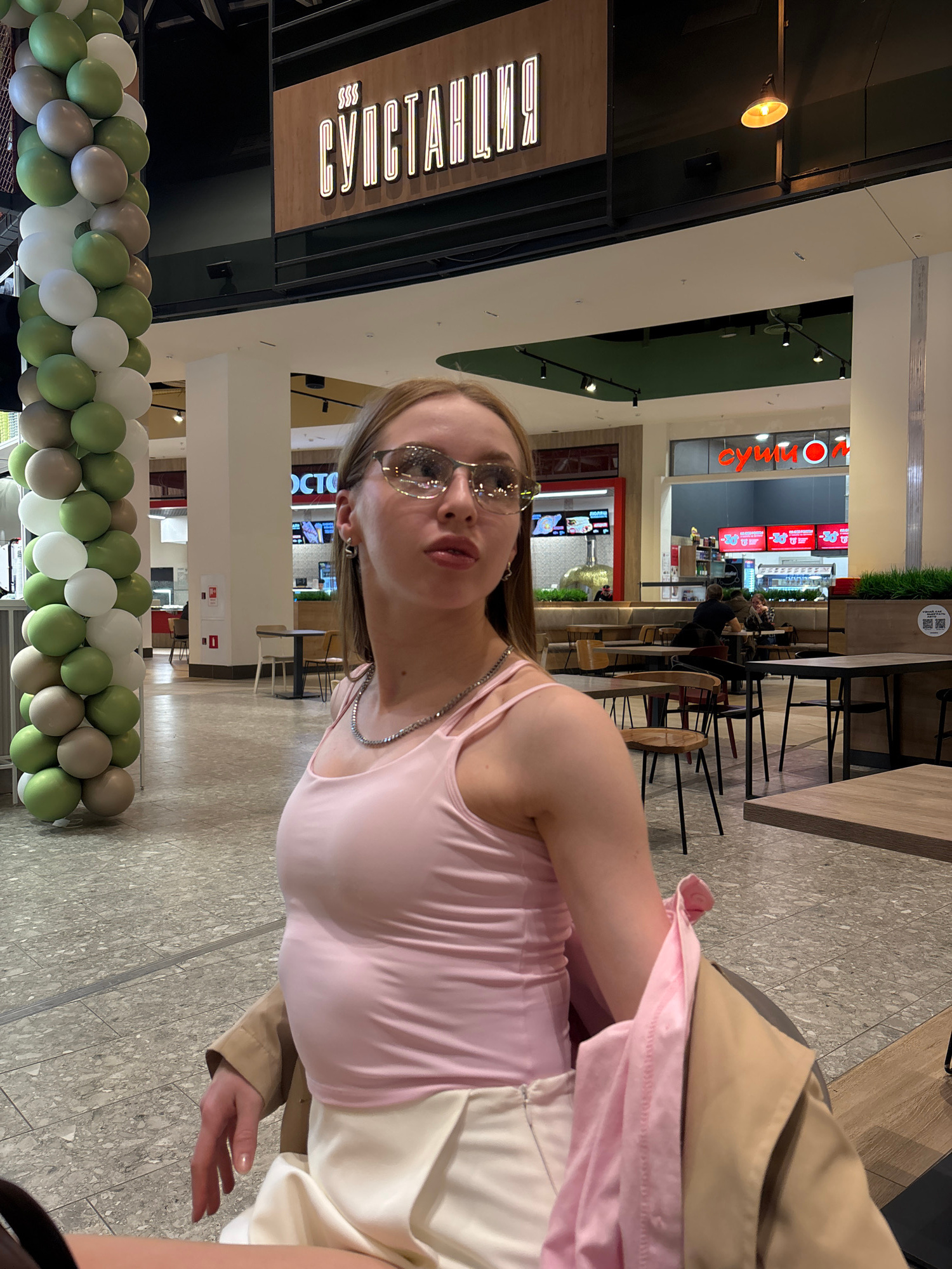 The image captures a young woman posing for a photo in an indoor setting, likely a shopping mall or a large food court in Perm, Russia. The woman is positioned on the right, looking directly at the ca…read more