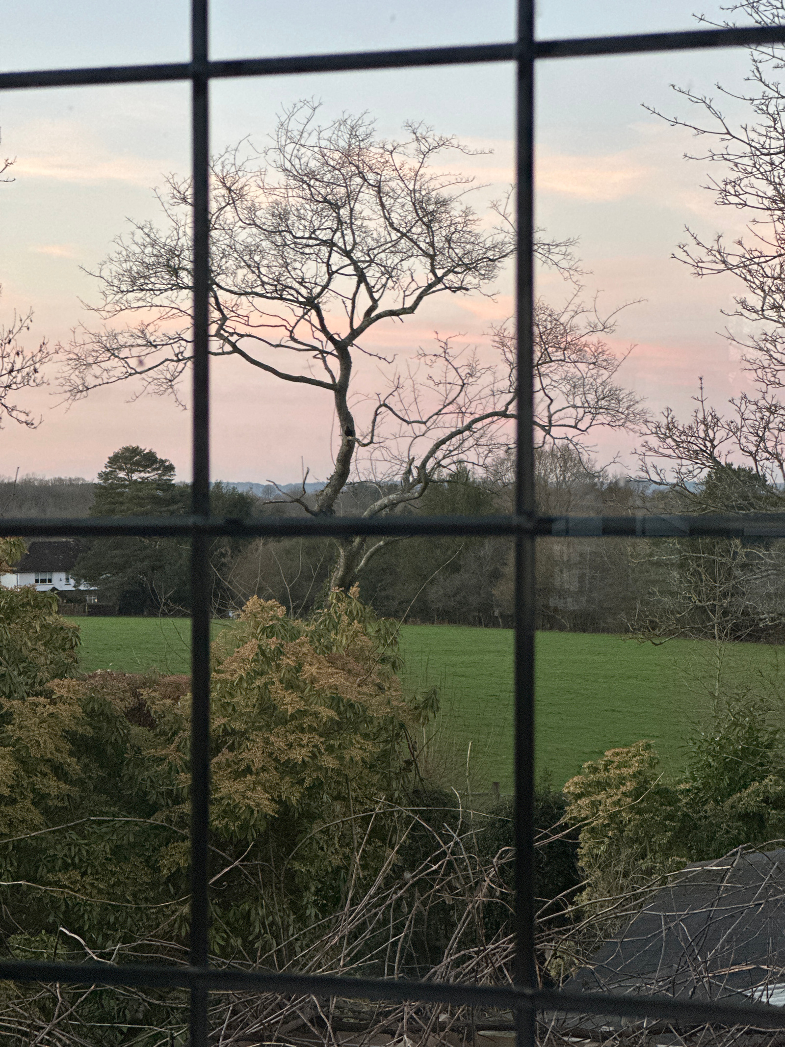 The image displays an outdoor landscape viewed through a dark window grid, likely located in Wealden, United Kingdom. The upper portion of the scene features a sky with a pale blue gradient transition…read more