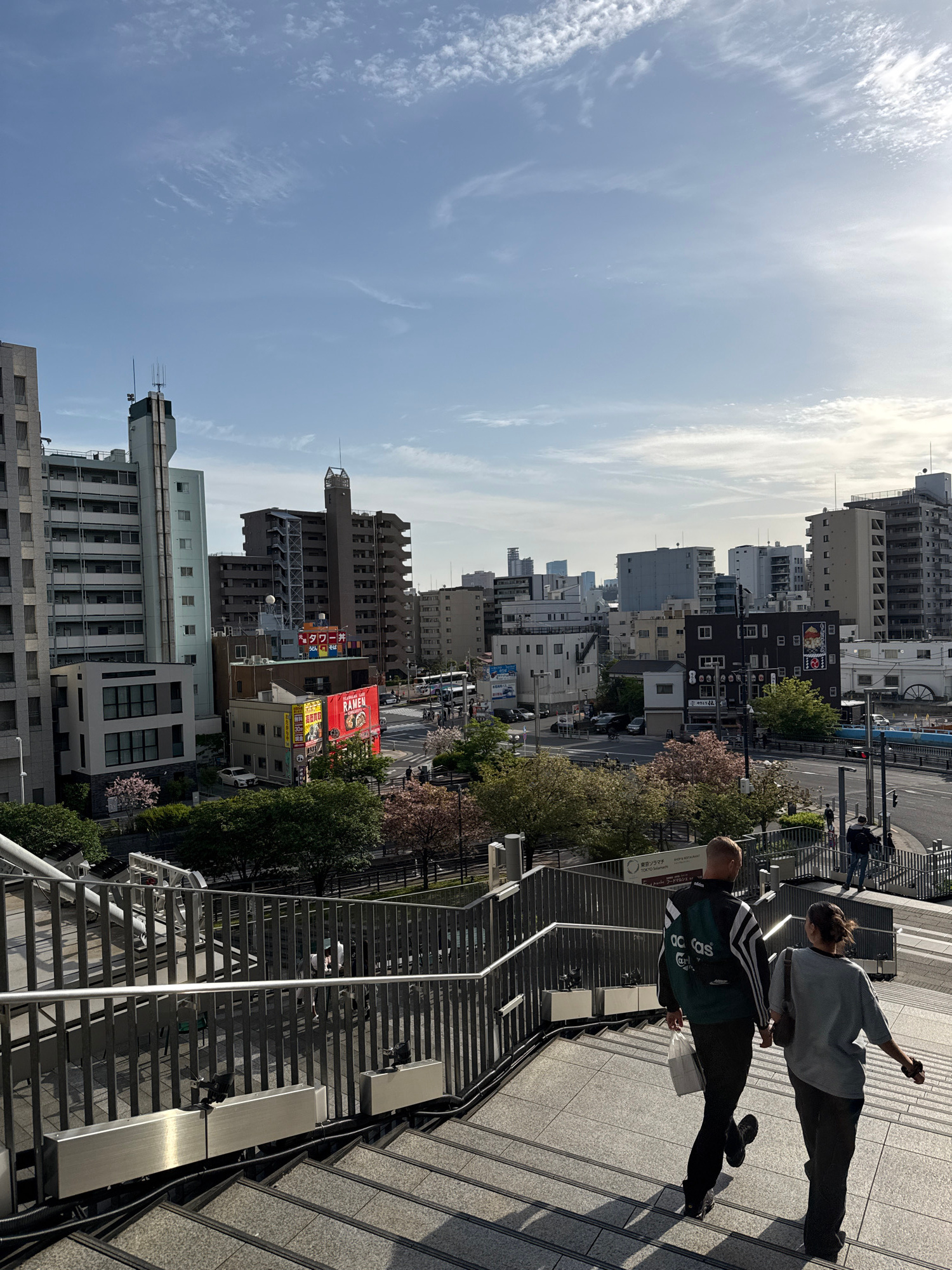 The image captures an urban scene in Sumida, Japan, on a bright day, likely late morning or early afternoon, given the strong sunlight and clear shadows. The sky is blue with scattered, wispy white cl…read more