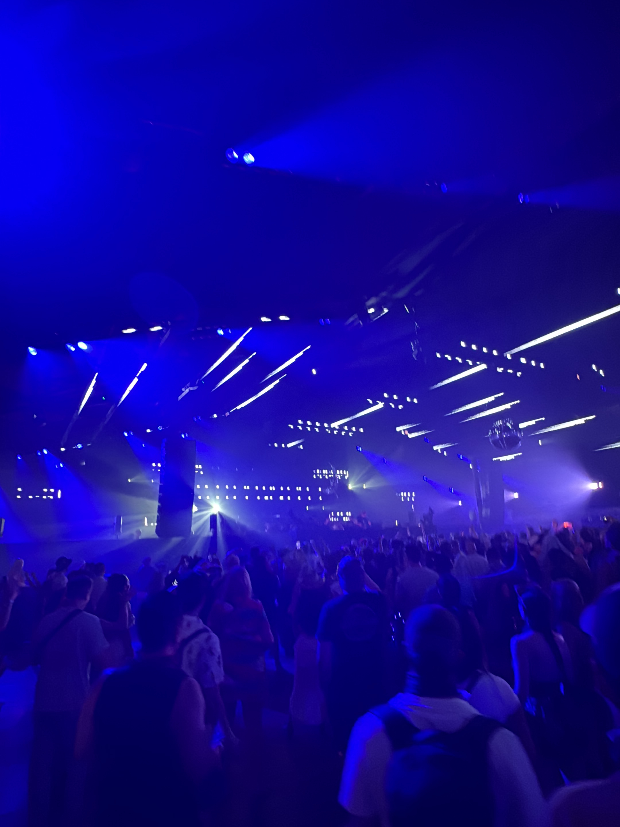 The image shows a large crowd of people at an indoor music event, possibly a rave, in what is presumably Coachella, United States. The lighting is predominantly blue, with bright white spotlights and…read more