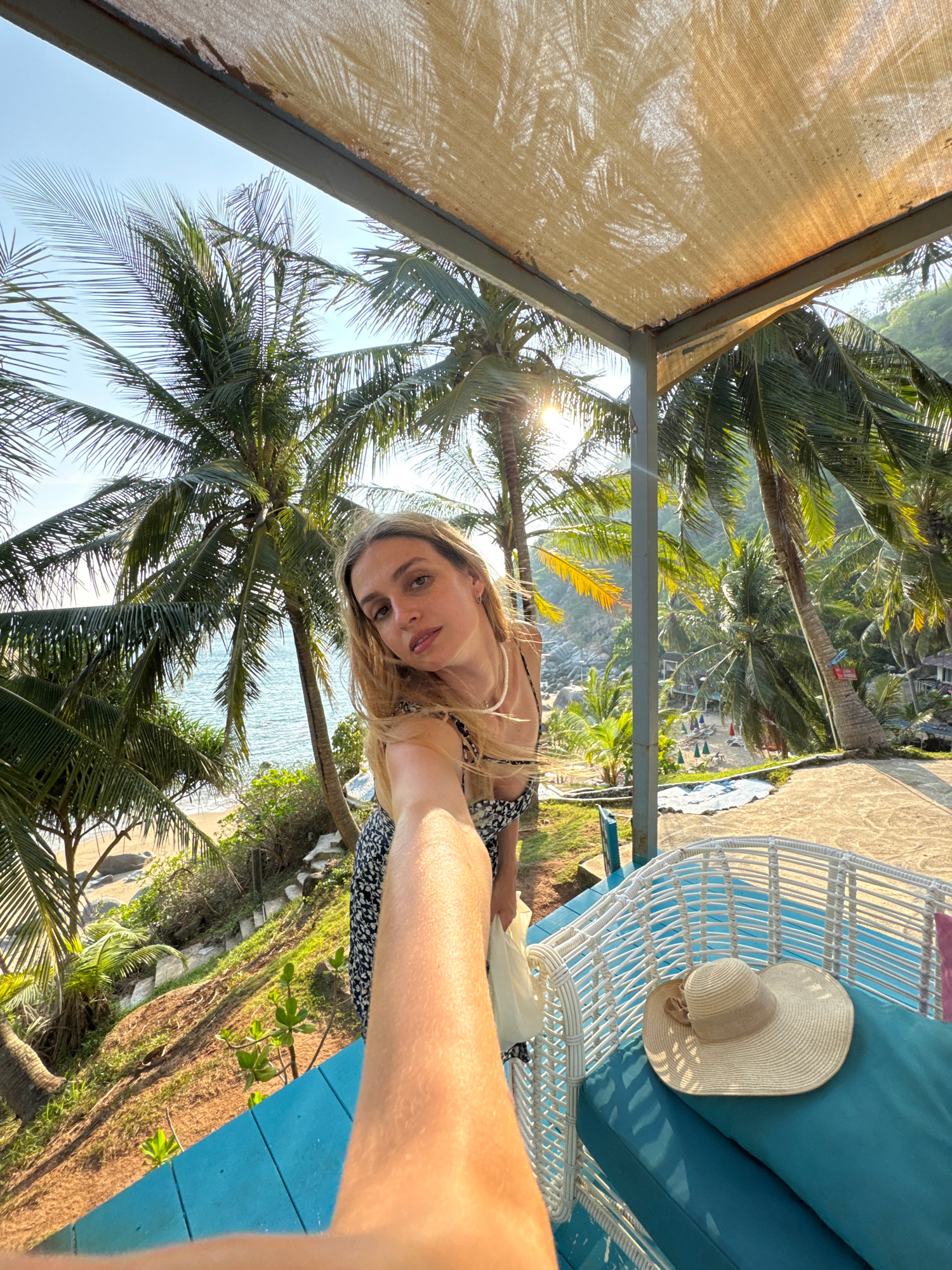 A Caucasian woman with long blonde hair takes a selfie while sitting in a white wicker chair with blue cushions. A straw hat rests on the cushions beside her. The scene is outdoors and includes numero…read more