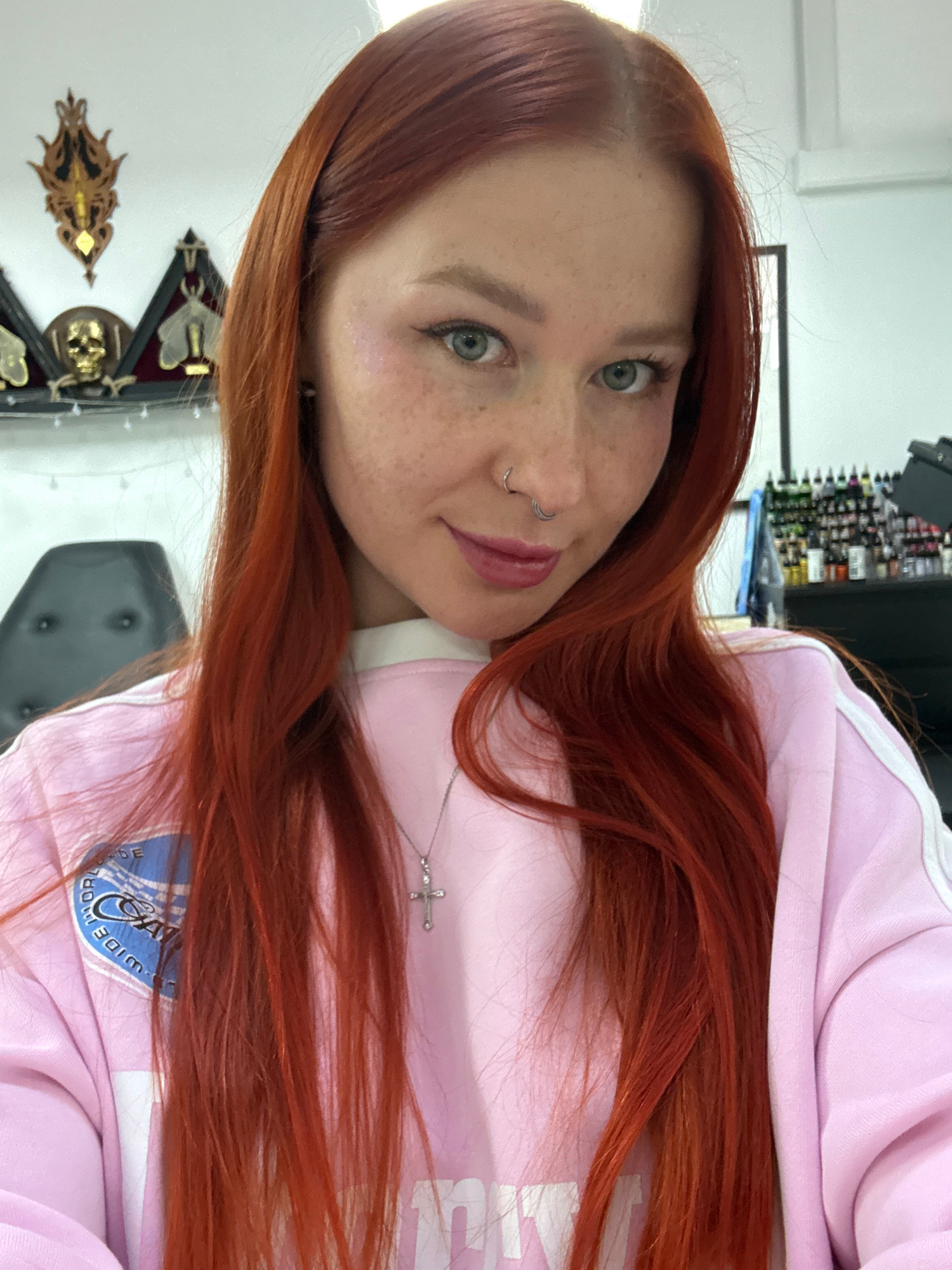 A young woman with long, vibrant red hair and light eyes, possibly green or blue, is captured in a close-up indoor portrait. She has visible freckles across her nose and cheeks. Her nose features a do…read more
