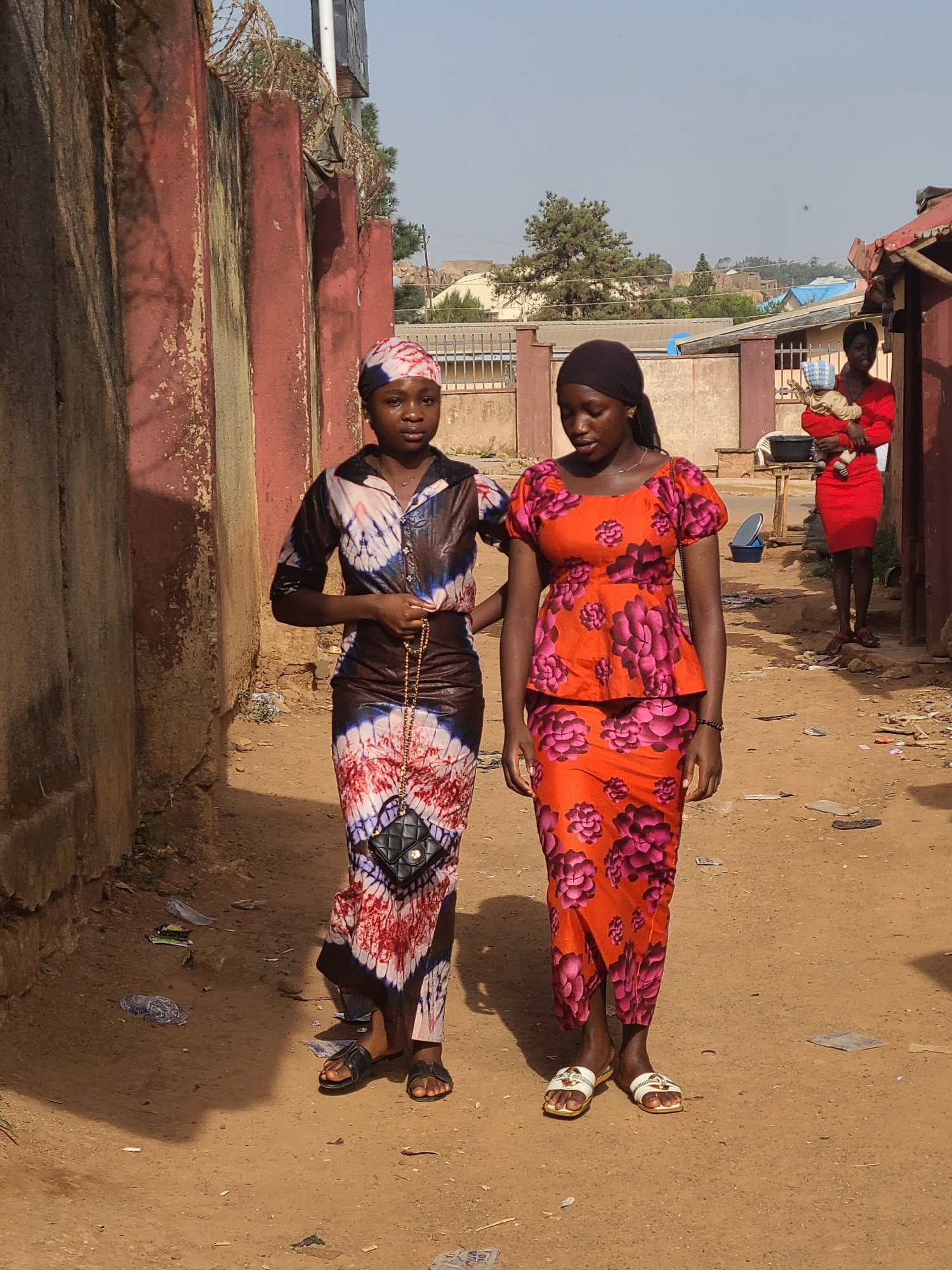 The image shows two women standing on a dirt road next to a red wall. One woman is wearing an orange and pink floral patterned outfit, while the other is wearing a tie-dye dress with a black purse. A…read more