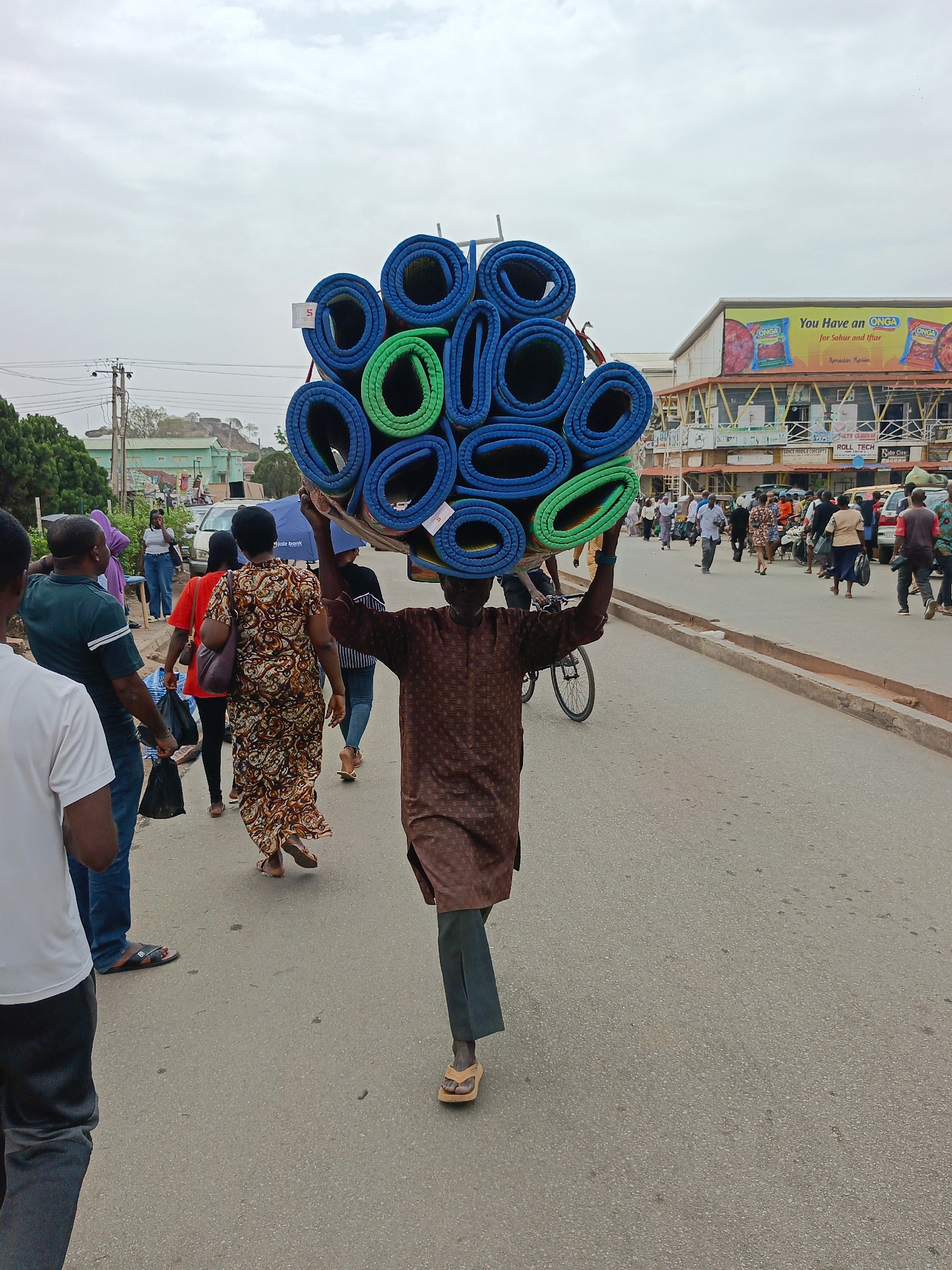 A wide, eye-level shot captures a man carrying a large bundle of rolled-up exercise mats on his head. The mats are predominantly blue, with some green ones interspersed. He is walking towards the viewer on a paved street, wearing a long-sleeved brown shirt with a patterned design and dark pants. His feet are clad in flip-flops. Around him, other pedestrians walk in both directions, some facing the camera and others with their backs to it. A bicycle is visible in the background, near the man. On the right side of the frame, a sidewalk with more people is evident. A building with several businesses and an advertisement featuring the word "ONGA" can be seen in the background. The sky above is overcast and pale. Utility poles and wires are visible in the upper left corner of the shot. The scene is a busy street with people engaged in various activities. | Open Wire