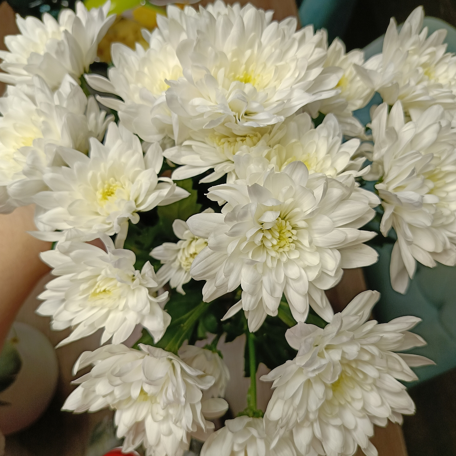 The image shows a close-up view of a bouquet of white chrysanthemums. The flowers are densely packed together, with visible green stems and leaves peeking through. The lighting is soft, casting gentle…read more