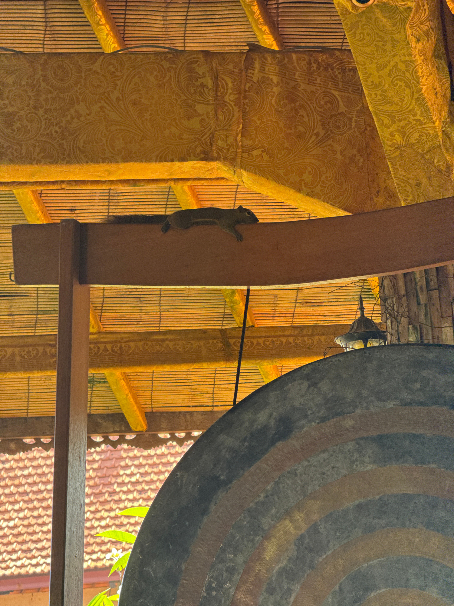 The image, originally rotated 90 degrees clockwise, depicts a rich and detailed traditional Indonesian architectural setting, likely an interior or semi-open space. A small, grey-brown animal, resemb…read more