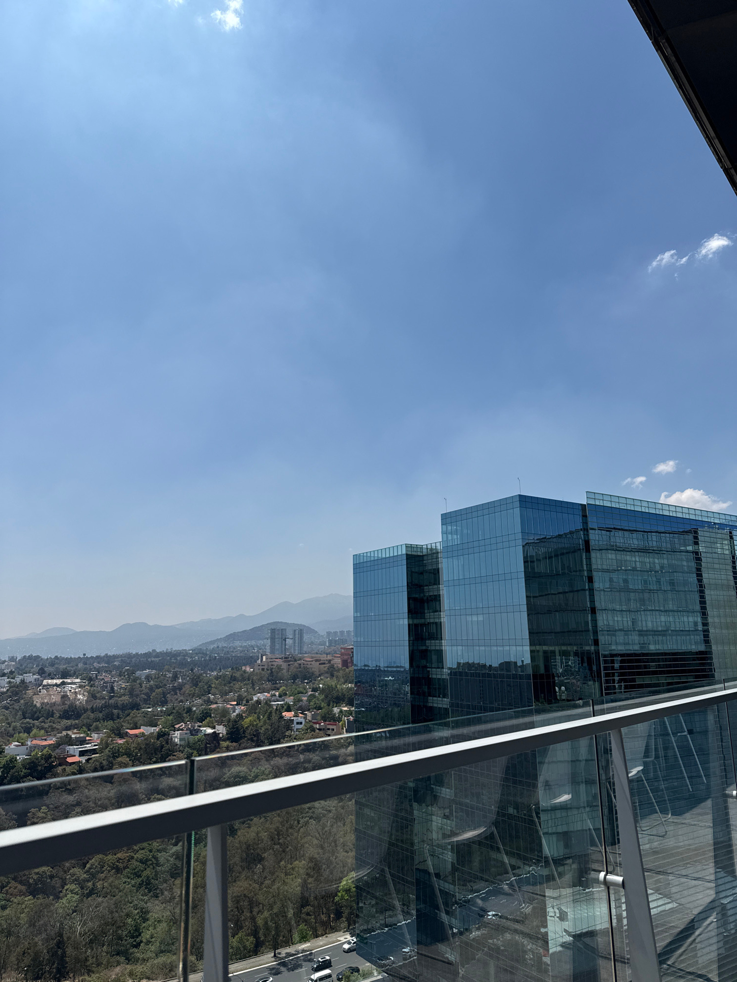 The image shows a view from a high vantage point, likely a tall building in Mexico City, Mexico. The sky is a clear blue with some haze and few scattered clouds. The cityscape below includes buildings…read more